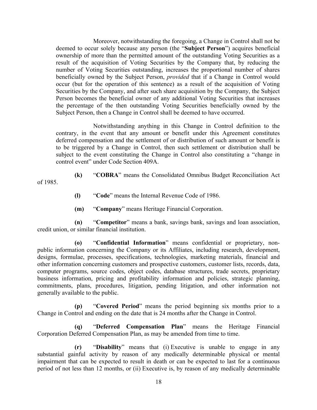 22 number of Voting Securities outstanding, increases the proportional number of shares beneficially owned by the Subject Person, provided that if a Change in Control would occur (but for the operation of this sentence) as a result of the acquisition of Voting Securities by the Company, and after such share acquisition by the Company, the Subject Person becomes the beneficial owner of any additional Voting Securities that increases the percentage of the then outstanding Voting Securities beneficially owned by the Subject Person, then a Change in Control shall be deemed to have occurred. Notwithstanding anything in this Change in Control definition to the contrary, in the event that any amount or benefit under this Agreement constitutes deferred compensation and the settlement of or distribution of such amount or benefit is to be triggered by a Change in Control, then such settlement or distribution shall be subject to the event constituting the Change in Control also constituting a “change in control event” under Code Section 409A. (m) “COBRA” means the Consolidated Omnibus Budget Reconciliation Act of 1985. (n) “Code” means the Internal Revenue Code of 1986. (o) “Company” means Heritage Financial Corporation. (p) “Competitor” means a bank, savings bank, savings and loan association, credit union, or similar financial institution. (q) “Confidential Information” means confidential or proprietary, non- public information concerning the Company or its Affiliates, including research, development, designs, formulae, processes, specifications, technologies, marketing materials, financial and other information concerning customers and prospective customers, customer lists, records, data, computer programs, source codes, object codes, database structures, trade secrets, proprietary business information, pricing and profitability information and policies, strategic planning, commitments, plans, procedures, litigation, pending litigation, and other information not generally available to the public. (r) “Non-Officer Period” has the meaning set forth in Section 2(d). (s) “Covered Period” means the period beginning six months prior to a Change in Control and ending on the CEO Retirement Date. (t) “Deferred Compensation Plan” has the meaning set forth in Section 5(d). (u) “Disability” means that (i) Executive is unable to engage in any substantial gainful activity by reason of any medically determinable physical or mental impairment that can be expected to result in death or can be expected to last for a continuous