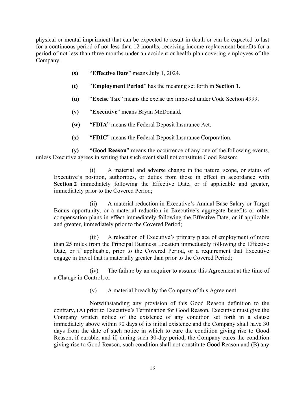 23 period of not less than 12 months, or (ii) Executive is, by reason of any medically determinable physical or mental impairment that can be expected to result in death or can be expected to last for a continuous period of not less than 12 months, receiving income replacement benefits for a period of not less than three months under an accident or health plan covering employees of the Company. (v) “Effective Date” means July 1, 2024. (w) “Excise Tax” means the excise tax imposed under Code Section 4999. (x) “Executive” means Jeffrey J. Deuel. (y) “FDIA” means the Federal Deposit Insurance Act. (z) “FDIC” means the Federal Deposit Insurance Corporation. (aa) “Good Reason,” except as otherwise provided herein, means the occurrence of any one of the following events prior to the CEO Retirement Date, unless Executive agrees in writing that such event shall not constitute Good Reason: (i) A material and adverse change in the nature, scope, or status of Executive’s position, authorities, or duties from those in effect in accordance with Section 4 immediately following the Effective Date, or if applicable and greater, immediately prior to the Covered Period; (ii) A material reduction in Executive’s Annual Base Salary or Target Bonus opportunity, or a material reduction in Executive’s aggregate benefits or other compensation plans in effect immediately following the Effective Date, or if applicable and greater, immediately prior to the Covered Period; (iii) A relocation of Executive’s primary place of employment of more than 35 miles from Executive’s primary place of employment immediately following the Effective Date, or if applicable, prior to the Covered Period, or a requirement that Executive engage in travel that is materially greater than prior to the Covered Period; (iv) Removal of Executive from, or failure to elect Executive to, the Board, or the Heritage Board, unless such board of directors is no longer in existence; (v) The failure by an acquirer to assume this Agreement at the time of a Change in Control; or (vi) A material breach by the Company of this Agreement. Notwithstanding any provision of this Good Reason definition to the contrary, (A) prior to Executive’s Termination for Good Reason, Executive must give the Company written notice of the existence of any condition set forth in a clause