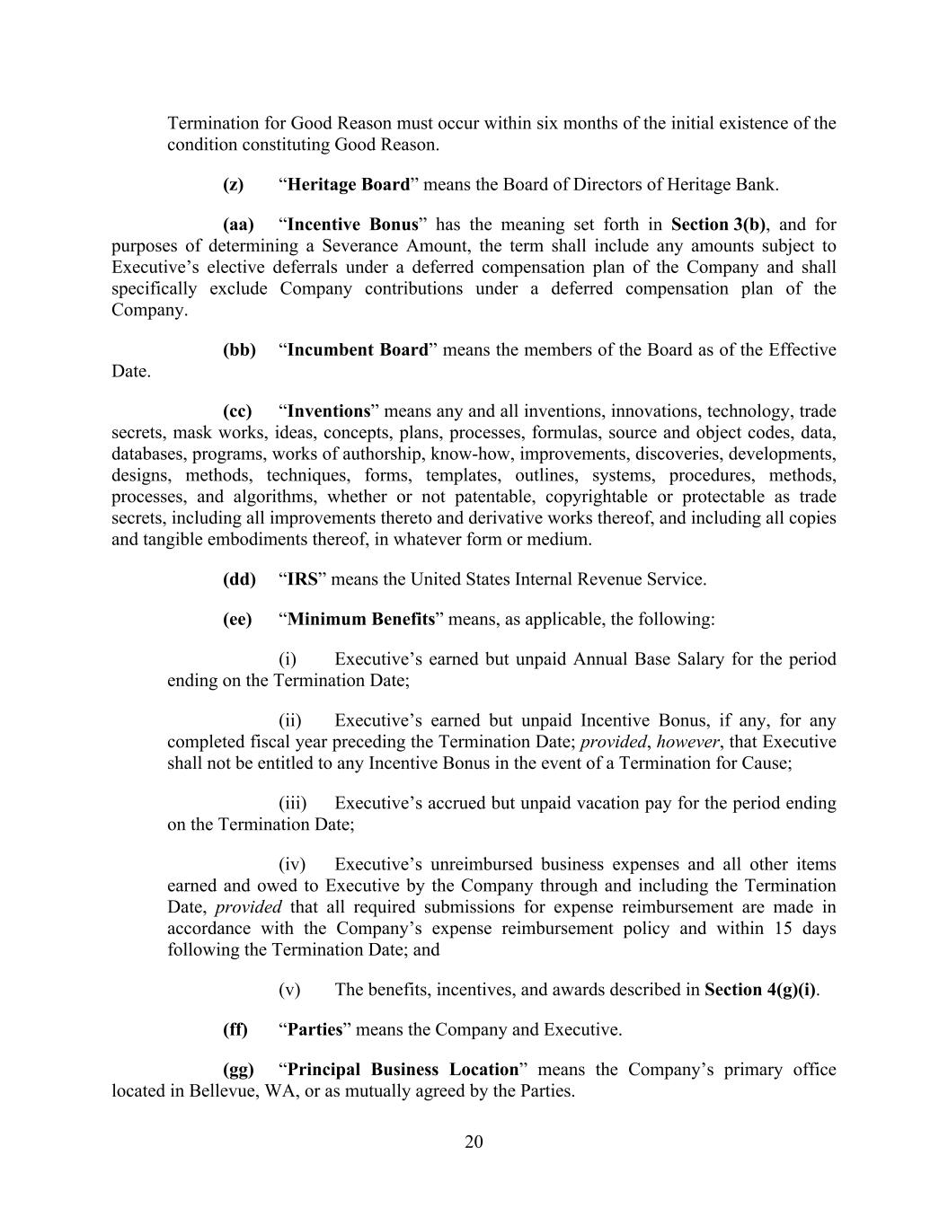 24 immediately above within 90 days of its initial existence and the Company shall have 30 days from the date of such notice in which to cure the condition giving rise to Good Reason, if curable, and if, during such 30-day period, the Company cures the condition giving rise to Good Reason, such condition shall not constitute Good Reason and (B) any Termination for Good Reason must occur within six months of the initial existence of the condition constituting Good Reason. (bb) “Heritage Board” means the Board of Directors of Heritage Bank. (cc) “Incentive Bonus” has the meaning set forth in Section 5(b), and for purposes of determining a Severance Amount, the term shall include any amounts required to be deferred subject to Executive’s elective deferrals under a deferred compensation plan of the Company and shall specifically exclude Company contributions under a deferred compensation plan of the Company. (dd) “Incumbent Board” means the members of the Board as of the Effective Date. (ee) “Inventions” means all systems, procedures, techniques, manuals, databases, plans, lists, inventions, trade secrets, copyrights, patents, trademarks, discoveries, innovations, concepts, ideas, and software conceived, compiled, or developed by Executive in the course of Executive’s employment with the Company or its Affiliates and/or comprised, in whole or part, of Confidential Information. Notwithstanding the foregoing sentence, Inventions shall not include: (i) any inventions independently developed by Executive and not derived, in whole or part, from any Confidential Information or (ii) any invention made by Executive prior to Executive’s exposure to any Confidential Information. (ff) “IRS” means the United States Internal Revenue Service. (gg) “Minimum Benefits” means, as applicable, the following: (i) Executive’s earned but unpaid Annual Base Salary for the period ending on the Termination Date; (ii) Executive’s earned but unpaid Incentive Bonus, if any, for any completed fiscal year preceding the Termination Date; provided, however, that Executive shall not be entitled to any Incentive Bonus in the event of a Termination for Cause; (iii) Executive’s accrued but unpaid vacation pay, if any, for the period ending on the Termination Date; (iv) Executive’s unreimbursed business expenses and all other items earned and owed to Executive by the Company through and including the Termination Date, provided that all required submissions for expense reimbursement are made in