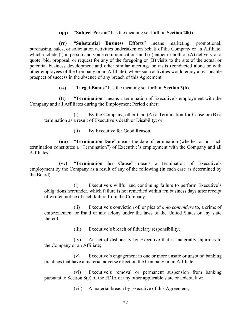 26 repayment or return of any payments made to Executive for any reason, including the Company, an Affiliate or their successors later obtaining information indicating that Executive has committed, is substantially responsible for, or has violated, the respective acts or omissions, conditions, or offenses outlined under 12 C.F.R. 359.4(a)(4). (rr) “Specified Employee” means any person who is a “key employee” (as defined in Code Section 416(i) without regard to paragraph (5) thereof), as determined by the Company based upon the 12-month period ending on each December 31st (such 12-month period is referred to below as the “identification period”). If Executive is determined to be a key employee, Executive shall be treated as a Specified Employee for purposes of this Agreement during the 12-month period that begins on the April 1 following the close of the identification period. For purposes of determining whether Executive is a key employee, “compensation” means Executive’s W-2 compensation as reported by the Company for a particular calendar year. (ss) “Subject Person” has the meaning set forth in Section 25(i). (tt) “Substantial Business Efforts” means marketing, promotional, purchasing, sales, or solicitation activities undertaken on behalf of the Company or an Affiliate, which include (i) in person and voice communications and (ii) either or both of (A) delivery of a quote, bid, proposal, or request for any of the foregoing or (B) visits to the site of the actual or potential business development and other similar meetings or visits (conducted alone or with other employees of the Company or an Affiliate), where such activities would enjoy a reasonable prospect of success in the absence of any breach of this Agreement. (uu) “Target Bonus” means the target Incentive Bonus for the applicable fiscal year performance period, if one is used, and if not, the Target Bonus shall be determined based upon the mid-point between the maximum Incentive Bonus and the threshold Incentive Bonus for the applicable fiscal year performance period, with the threshold bonus based upon the first level of performance for which some amount of Incentive Bonus would be payable. (vv) “Termination” means a termination of Executive’s employment with the Company and all Affiliates during the CEO Period either: (i) By the Company, other than (A) a Termination for Cause or (B) a termination as a result of Executive’s death or Disability; or (ii) By Executive for Good Reason. (ww) “Termination Date” means the date of termination (whether or not such termination constitutes a “Termination”) of Executive’s employment or engagement with the Company and all Affiliates. (xx) “Termination for Cause” means a termination of Executive’s employment or engagement by the Company as a result of any of the following (in each case as determined by the Board):