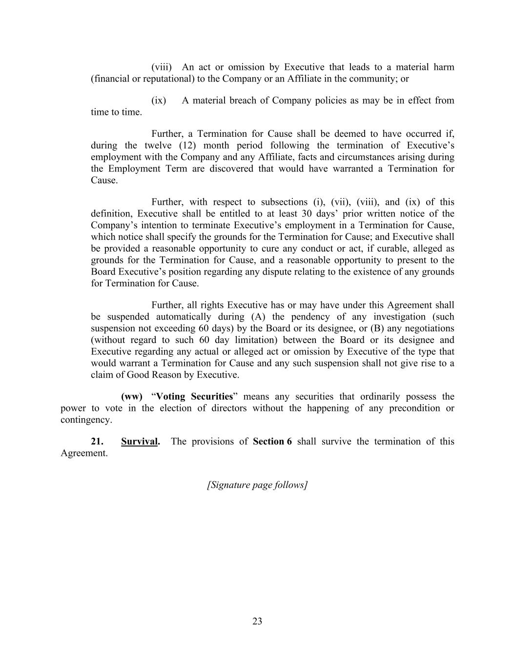 28 Executive regarding any actual or alleged act or omission by Executive of the type that would warrant a Termination for Cause and any such suspension shall not give rise to a claim of Good Reason by Executive. (yy) “Transition Services” has the meaning set forth in Section 7(a). (zz) “Voting Securities” means any securities that ordinarily possess the power to vote in the election of directors without the happening of any precondition or contingency. 26. Survival. The provisions of Sections 9(e), 9(g), 10, and 11 shall survive the termination of this Agreement. [Signature page follows]