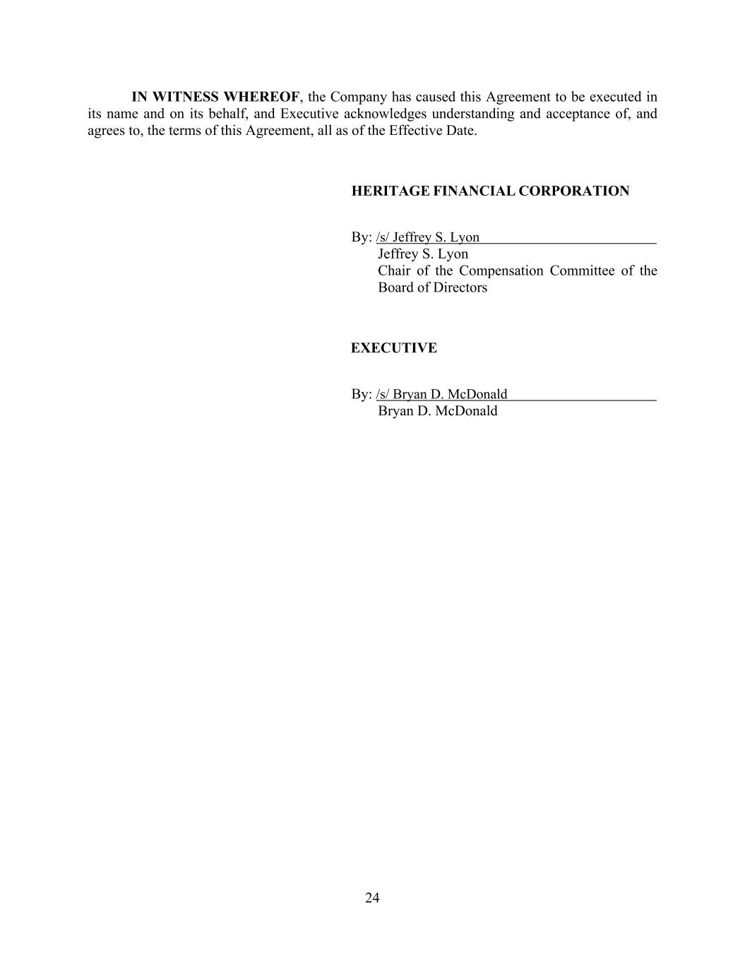 29 IN WITNESS WHEREOF, the Company has caused this Agreement to be executed in its name and on its behalf, and Executive acknowledges understanding and acceptance of, and agrees to, the terms of this Agreement, all as of the Effective Date. HERITAGE FINANCIAL CORPORATION By: /s/ Jeffrey S. Lyon Jeffrey S. Lyon Chair of the Compensation Committee of the Board of Directors EXECUTIVE By: /s/ Jeffrey J. Duel Jeffrey J. Deuel