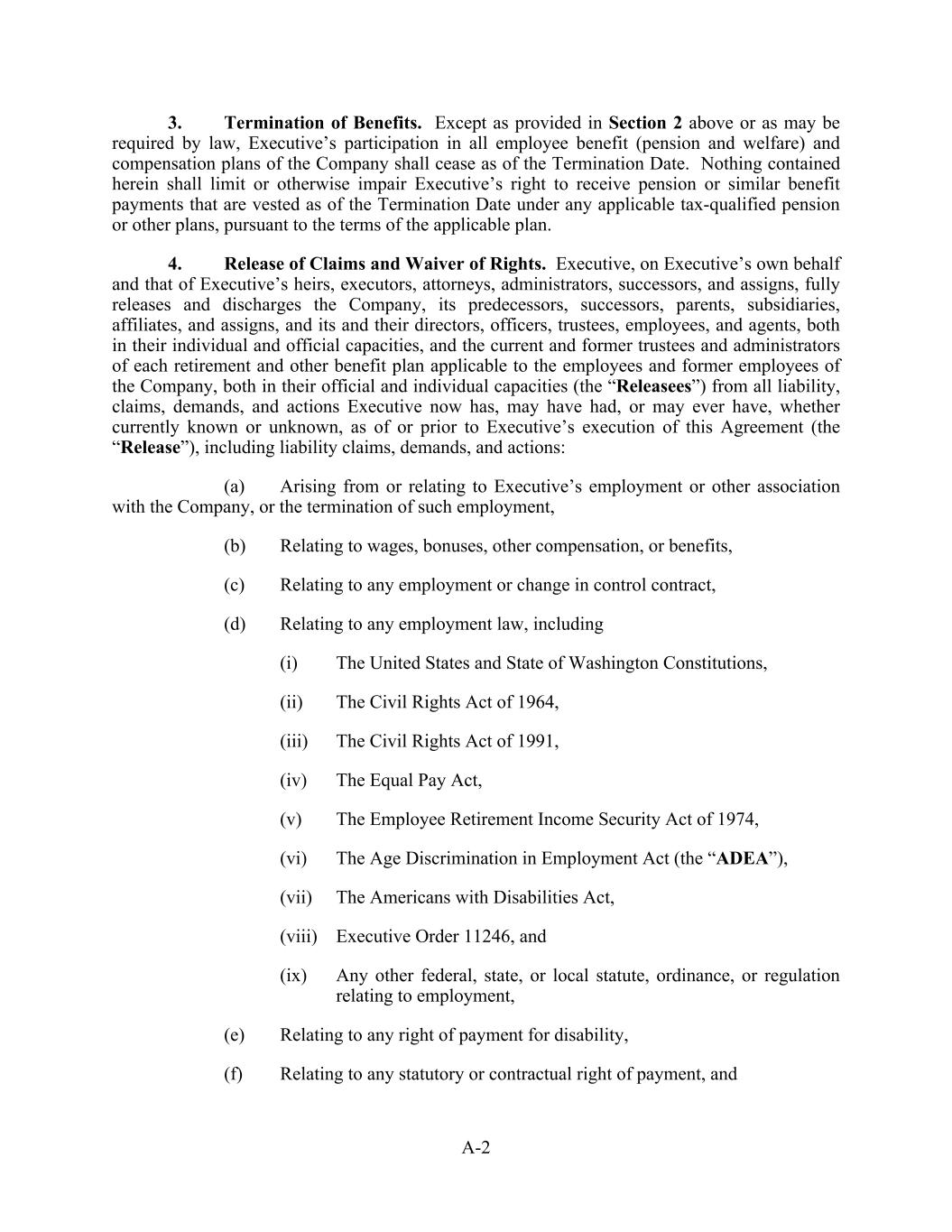 A-2 (e) Withholding. The Severance Payments, as may be required, shall be treated as wages and subject to all taxes and other payroll deductions required by law. 3. Termination of Benefits. Except as provided in Section 2 above or as may be required by law, Executive’s participation in all employee benefit (pension and welfare) and compensation plans of the Company shall cease as of the Termination Date. Nothing contained herein shall limit or otherwise impair Executive’s right to receive pension or similar benefit payments that are vested as of the Termination Date under any applicable tax-qualified pension or other plans, pursuant to the terms of the applicable plan. 4. Release of Claims and Waiver of Rights. Executive, on Executive’s own behalf and that of Executive’s heirs, executors, attorneys, administrators, successors, and assigns, fully releases and discharges the Company, its predecessors, successors, parents, subsidiaries, affiliates, and assigns, and its and their directors, officers, trustees, employees, and agents, both in their individual and official capacities, and the current and former trustees and administrators of each retirement and other benefit plan applicable to the employees and former employees of the Company, both in their official and individual capacities (the “Releasees”) from all liability, claims, demands, and actions Executive now has, may have had, or may ever have, whether currently known or unknown, as of or prior to Executive’s execution of this Agreement (the “Release”), including liability claims, demands, and actions: (a) Arising from or relating to Executive’s employment or other association with the Company, or the termination of such employment or association, (b) Relating to wages, bonuses, other compensation, or benefits, (c) Relating to any employment or change in control contract, (d) Relating to any employment law, including (i) The United States and State of Washington Constitutions, (ii) The Civil Rights Act of 1964, (iii) The Civil Rights Act of 1991, (iv) The Equal Pay Act, (v) The Employee Retirement Income Security Act of 1974, (vi) The Age Discrimination in Employment Act (the “ADEA”), (vii) The Americans with Disabilities Act, (viii) Executive Order 11246, and (ix) Any other federal, state, or local statute, ordinance, or regulation relating to employment, (e) Relating to any right of payment for disability,