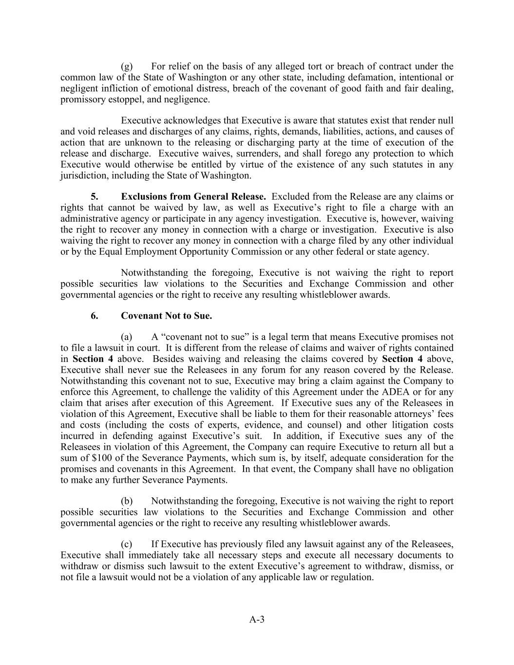 A-3 (f) Relating to any statutory or contractual right of payment, and (g) For relief on the basis of any alleged tort or breach of contract under the common law of the State of Washington or any other state, including defamation, intentional or negligent infliction of emotional distress, breach of the covenant of good faith and fair dealing, promissory estoppel, and negligence. Executive acknowledges that Executive is aware that statutes exist that render null and void releases and discharges of any claims, rights, demands, liabilities, actions, and causes of action that are unknown to the releasing or discharging party at the time of execution of the release and discharge. Executive waives, surrenders, and shall forego any protection to which Executive would otherwise be entitled by virtue of the existence of any such statutes in any jurisdiction, including the State of Washington. 5. Exclusions from General Release. (a) Excluded from the Release are any claims or rights that cannot be waived by law, as well as Executive’s right to file a charge with an administrative agency or participate in any agency investigation. Executive is, however, waiving the right to recover any money in connection with a charge or investigation. Executive is also waiving the right to recover any money in connection with a charge filed by any other individual or by the Equal Employment Opportunity Commission or any other federal or state agency. (b) Notwithstanding the foregoing, Executive is not waiving the right to report possible securities law violations to the Securities and Exchange Commission and other governmental agencies or the right to receive any resulting whistleblower awards. 6. Covenant Not to Sue. (a) A “covenant not to sue” is a legal term that means Executive promises not to file a lawsuit in court. It is different from the release of claims and waiver of rights contained in Section 4 above. Besides waiving and releasing the claims covered by Section 4 above, Executive shall never sue the Releasees in any forum for any reason covered by the Release. Notwithstanding this covenant not to sue, Executive may bring a claim against the Company to enforce this Agreement, to challenge the validity of this Agreement under the ADEA or for any claim that arises after execution of this Agreement. If Executive sues any of the Releasees in violation of this Agreement, Executive shall be liable to them for their reasonable attorneys’ fees and costs (including the costs of experts, evidence, and counsel) and other litigation costs incurred in defending against Executive’s suit. In addition, if Executive sues any of the Releasees in violation of this Agreement, the Company can require Executive to return all but a sum of $100 of the Severance Payments, which sum is, by itself, adequate consideration for the promises and covenants in this Agreement. In that event, the Company shall have no obligation to make any further Severance Payments. (b) Notwithstanding the foregoing, Executive is not waiving the right to report possible securities law violations to the Securities and Exchange Commission and other governmental agencies or the right to receive any resulting whistleblower awards.