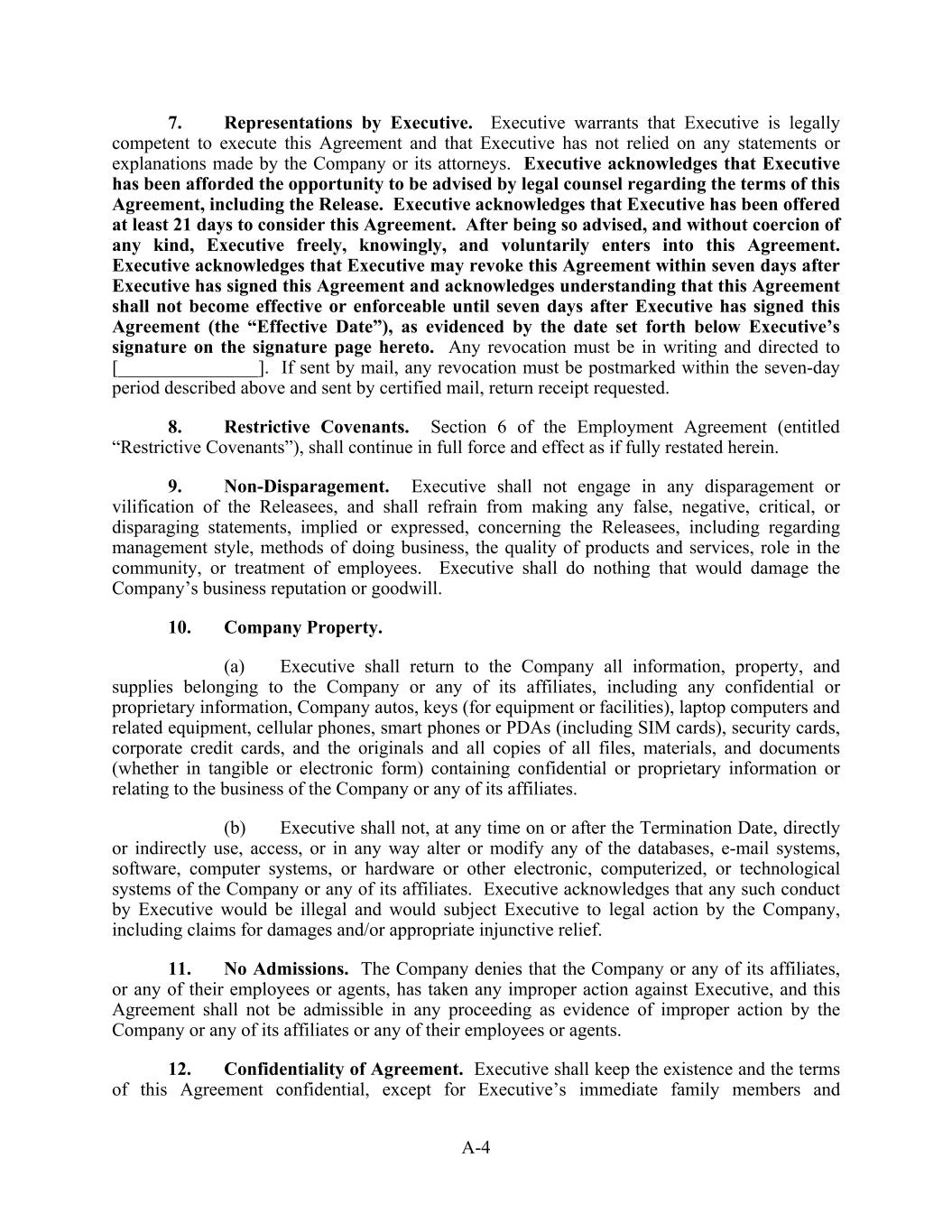 A-4 (c) If Executive has previously filed any lawsuit against any of the Releasees, Executive shall immediately take all necessary steps and execute all necessary documents to withdraw or dismiss such lawsuit to the extent Executive’s agreement to withdraw, dismiss, or not file a lawsuit would not be a violation of any applicable law or regulation. 7. Representations by Executive. Executive warrants that Executive is legally competent to execute this Agreement and that Executive has not relied on any statements or explanations made by the Company or its attorneys. Executive acknowledges that Executive has been afforded the opportunity to be advised by legal counsel regarding the terms of this Agreement, including the Release. Executive acknowledges that Executive has been offered at least 21 days to consider this Agreement. After being so advised, and without coercion of any kind, Executive freely, knowingly, and voluntarily enters into this Agreement. Executive acknowledges that Executive may revoke this Agreement within seven days after Executive has signed this Agreement and acknowledges understanding that this Agreement shall not become effective or enforceable until seven days after Executive has signed this Agreement (the “Effective Date”), as evidenced by the date set forth below Executive’s signature on the signature page hereto. Any revocation must be in writing and directed to [_______________]. If sent by mail, any revocation must be postmarked within the seven-day period described above and sent by certified mail, return receipt requested. 8. Restrictive Covenants. Section 11 of the Employment Agreement (entitled “Restrictive Covenants”), shall continue in full force and effect as if fully restated herein. 9. Non-Disparagement. Executive shall not engage in any disparagement or vilification of the Releasees, and shall refrain from making any false, negative, critical, or disparaging statements, implied or expressed, concerning the Releasees, including regarding management style, methods of doing business, the quality of products and services, role in the community, or treatment of employees. Executive shall do nothing that would damage the Company’s business reputation or goodwill. 10. Company Property. (a) Executive shall return to the Company all information, property, and supplies belonging to the Company or any of its affiliates, including any confidential or proprietary information, Company autos, keys (for equipment or facilities), laptop computers and related equipment, cellular phones, smart phones or PDAs (including SIM cards), security cards, corporate credit cards, and the originals and all copies of all files, materials, and documents (whether in tangible or electronic form) containing confidential or proprietary information or relating to the business of the Company or any of its affiliates. (b) Executive shall not, at any time on or after the Termination Date, directly or indirectly use, access, or in any way alter or modify any of the databases, e-mail systems, software, computer systems, or hardware or other electronic, computerized, or technological systems of the Company or any of its affiliates. Executive acknowledges that any such conduct by Executive would be illegal and would subject Executive to legal action by the Company, including claims for damages and/or appropriate injunctive relief. 11. No Admissions. The Company denies that the Company or any of its affiliates, or any of their employees or agents, has taken any improper action against Executive, and this
