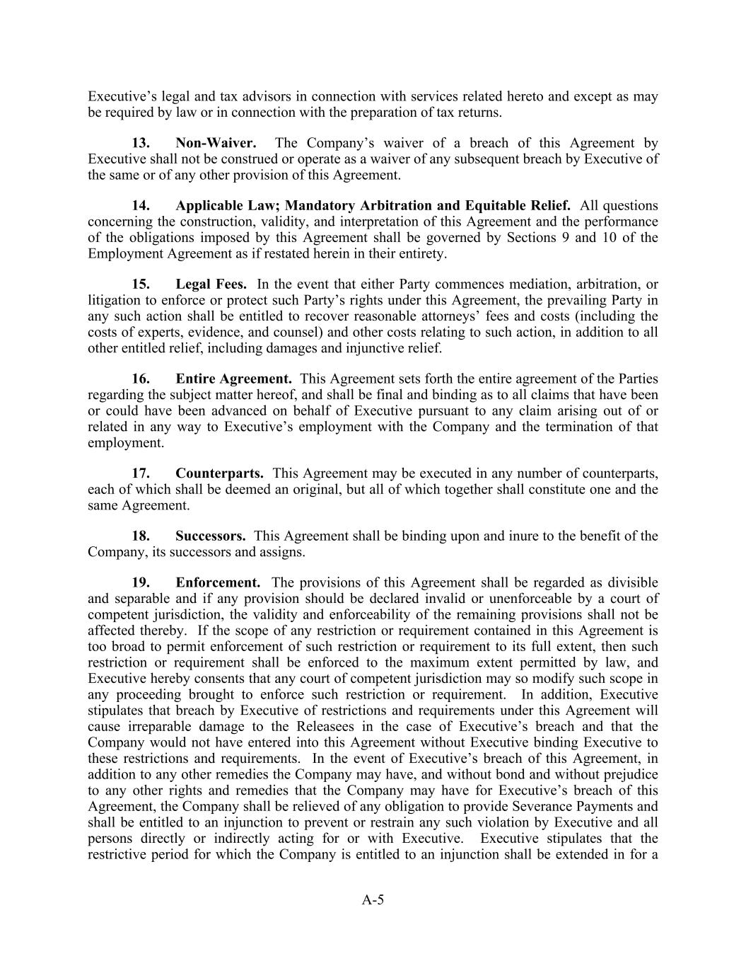 A-5 Agreement shall not be admissible in any proceeding as evidence of improper action by the Company or any of its affiliates or any of their employees or agents. 12. Confidentiality of Agreement. Executive shall keep the existence and the terms of this Agreement confidential, except for Executive’s immediate family members and Executive’s legal and tax advisors in connection with services related hereto and except as may be required by law or in connection with the preparation of tax returns. 13. Non-Waiver. The Company’s waiver of a breach of this Agreement by Executive shall not be construed or operate as a waiver of any subsequent breach by Executive of the same or of any other provision of this Agreement. 14. Applicable Law; Mandatory Arbitration and Equitable Relief. All questions concerning the construction, validity, and interpretation of this Agreement and the performance of the obligations imposed by this Agreement shall be governed by Sections 14 and 15 of the Employment Agreement as if restated herein in their entirety. 15. Legal Fees. In the event that either Party commences mediation, arbitration, or litigation to enforce or protect such Party’s rights under this Agreement, the prevailing Party in any such action shall be entitled to recover reasonable attorneys’ fees and costs (including the costs of experts, evidence, and counsel) and other costs relating to such action, in addition to all other entitled relief, including damages and injunctive relief. 16. Entire Agreement. This Agreement sets forth the entire agreement of the Parties regarding the subject matter hereof, and shall be final and binding as to all claims that have been or could have been advanced on behalf of Executive pursuant to any claim arising out of or related in any way to Executive’s employment with the Company and the termination of that employment. 17. Counterparts. This Agreement may be executed in any number of counterparts, each of which shall be deemed an original, but all of which together shall constitute one and the same Agreement. 18. Successors. This Agreement shall be binding upon and inure to the benefit of the Company, its successors and assigns. 19. Enforcement. The provisions of this Agreement shall be regarded as divisible and separable and if any provision should be declared invalid or unenforceable by a court of competent jurisdiction, the validity and enforceability of the remaining provisions shall not be affected thereby. If the scope of any restriction or requirement contained in this Agreement is too broad to permit enforcement of such restriction or requirement to its full extent, then such restriction or requirement shall be enforced to the maximum extent permitted by law, and Executive hereby consents that any court of competent jurisdiction may so modify such scope in any proceeding brought to enforce such restriction or requirement. In addition, Executive stipulates that breach by Executive of restrictions and requirements under this Agreement will cause irreparable damage to the Releasees in the case of Executive’s breach and that the Company would not have entered into this Agreement without Executive binding Executive to these restrictions and requirements. In the event of Executive’s breach of this Agreement, in addition to any other remedies the Company may have, and without bond and without prejudice