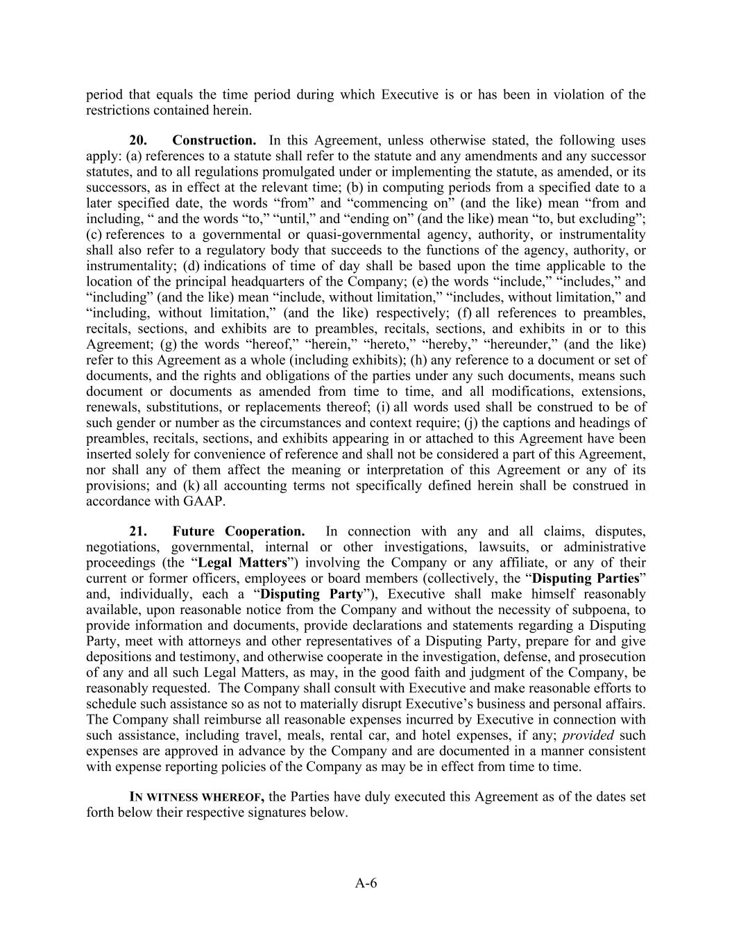A-6 to any other rights and remedies that the Company may have for Executive’s breach of this Agreement, the Company shall be relieved of any obligation to provide Severance Payments and shall be entitled to an injunction to prevent or restrain any such violation by Executive and all persons directly or indirectly acting for or with Executive. Executive stipulates that the restrictive period for which the Company is entitled to an injunction shall be extended in for a period that equals the time period during which Executive is or has been in violation of the restrictions contained herein. 20. Construction. In this Agreement, unless otherwise stated, the following uses apply: (a) references to a statute shall refer to the statute and any amendments and any successor statutes, and to all regulations promulgated under or implementing the statute, as amended, or its successors, as in effect at the relevant time; (b) in computing periods from a specified date to a later specified date, the words “from” and “commencing on” (and the like) mean “from and including,” and the words “to,” “until,” and “ending on” (and the like) mean “to, but excluding”; (c) references to a governmental or quasi-governmental agency, authority, or instrumentality shall also refer to a regulatory body that succeeds to the functions of the agency, authority, or instrumentality; (d) indications of time of day shall be based upon the time applicable to the location of the principal headquarters of the Company; (e) the words “include,” “includes,” and “including” (and the like) mean “include, without limitation,” “includes, without limitation,” and “including, without limitation,” (and the like) respectively; (f) all references to preambles, recitals, sections, and exhibits are to preambles, recitals, sections, and exhibits in or to this Agreement; (g) the words “hereof,” “herein,” “hereto,” “hereby,” “hereunder,” (and the like) refer to this Agreement as a whole (including exhibits); (h) any reference to a document or set of documents, and the rights and obligations of the parties under any such documents, means such document or documents as amended from time to time, and all modifications, extensions, renewals, substitutions, or replacements thereof; (i) all words used shall be construed to be of such gender or number as the circumstances and context require; (j) the captions and headings of preambles, recitals, sections, and exhibits appearing in or attached to this Agreement have been inserted solely for convenience of reference and shall not be considered a part of this Agreement, nor shall any of them affect the meaning or interpretation of this Agreement or any of its provisions; and (k) all accounting terms not specifically defined herein shall be construed in accordance with GAAP. 21. Future Cooperation. In connection with any and all claims, disputes, negotiations, governmental, internal or other investigations, lawsuits, or administrative proceedings (the “Legal Matters”) involving the Company or any affiliate, or any of their current or former officers, employees or board members (collectively, the “Disputing Parties” and, individually, each a “Disputing Party”), Executive shall make himself reasonably available, upon reasonable notice from the Company and without the necessity of subpoena, to provide information and documents, provide declarations and statements regarding a Disputing Party, meet with attorneys and other representatives of a Disputing Party, prepare for and give depositions and testimony, and otherwise cooperate in the investigation, defense, and prosecution of any and all such Legal Matters, as may, in the good faith and judgment of the Company, be reasonably requested. The Company shall consult with Executive and make reasonable efforts to schedule such assistance so as not to materially disrupt Executive’s business and personal affairs. The Company shall reimburse all reasonable expenses incurred by Executive in connection with such assistance, including travel, meals, rental car, and hotel expenses, if any; provided such