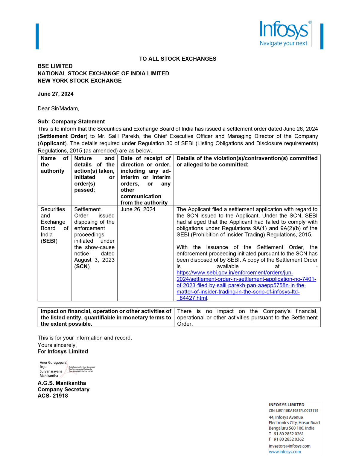 Infosys Limited, a company organized under the laws of the Republic of India ("Infosys", or the "Company"), hereby furnishes with the United States Securities and Exchange Commission this Report on Form 6-K regarding the intimation dated June 27, 2024 pertaining to settlement order issued by Securities and Exchange Board of India to Mr. Salil Parekh, the Chief Executive Officer and Managing Director of the Company.