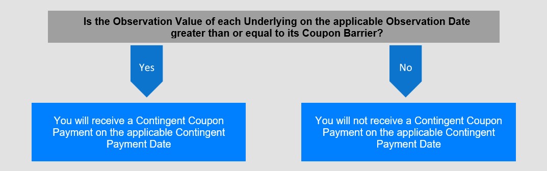 | Contingent Coupon Payment: | If, on any quarterly Observation Date, the Observation Value of each Underlying is greater than or equal to its Coupon Barrier, we will pay a Contingent Coupon Payment of $18.125 per $1,000.00 in principal amount of Notes (equal to a rate of 1.8125% per quarter or 7.25% per annum) on the applicable Contingent Payment Date (including the Maturity Date). |