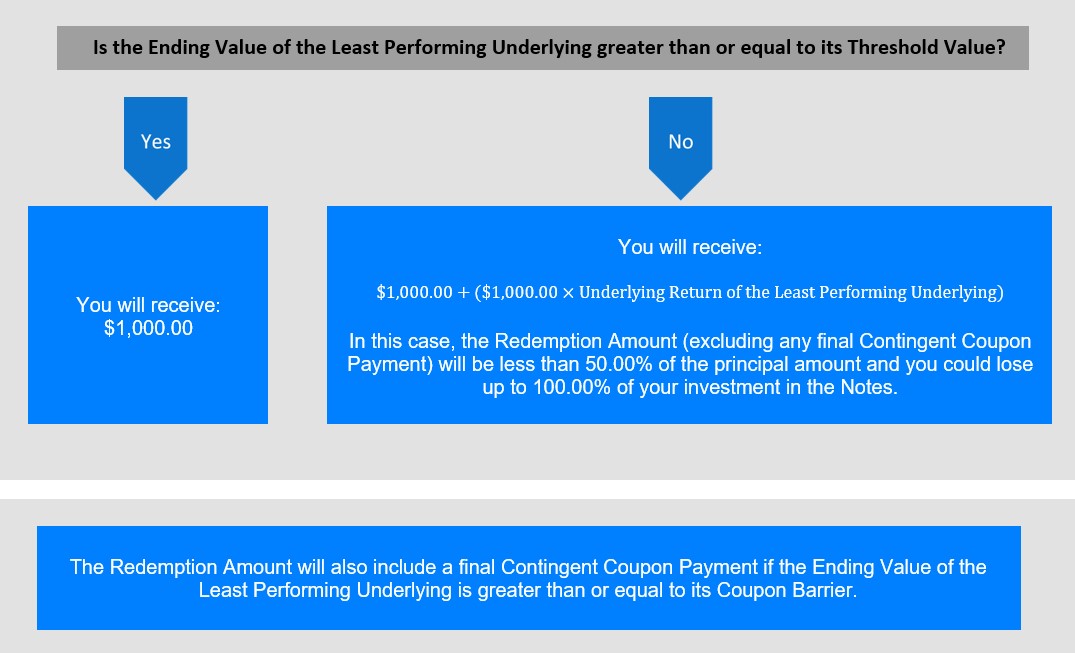 In this case, the Redemption Amount (excluding any final Contingent Coupon Payment) will be less than 50.00% of the principal amount and you could lose up to 100.00% of your investment in the Notes. The Redemption Amount will also include a final Contingent Coupon Payment if the Ending Value of the Least Performing Underlying is greater than or equal to its Coupon Barrier. |