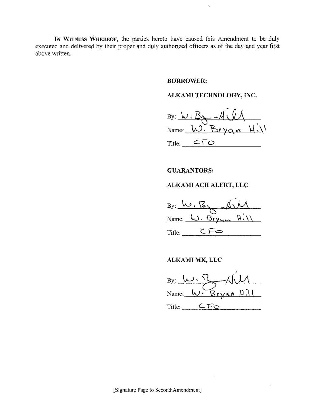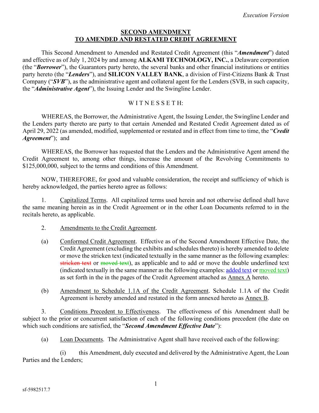 Execution Version 1 sf-5982517.7 SECOND AMENDMENT TO AMENDED AND RESTATED CREDIT AGREEMENT This Second Amendment to Amended and Restated Credit Agreement (this “Amendment”) dated and effective as of July 1, 2024 by and among ALKAMI TECHNOLOGY, INC., a Delaware corporation (the “Borrower”), the Guarantors party hereto, the several banks and other financial institutions or entities party hereto (the “Lenders”), and SILICON VALLEY BANK, a division of First-Citizens Bank & Trust Company (“SVB”), as the administrative agent and collateral agent for the Lenders (SVB, in such capacity, the “Administrative Agent”), the Issuing Lender and the Swingline Lender. W I T N E S S E T H: WHEREAS, the Borrower, the Administrative Agent, the Issuing Lender, the Swingline Lender and the Lenders party thereto are party to that certain Amended and Restated Credit Agreement dated as of April 29, 2022 (as amended, modified, supplemented or restated and in effect from time to time, the “Credit Agreement”); and WHEREAS, the Borrower has requested that the Lenders and the Administrative Agent amend the Credit Agreement to, among other things, increase the amount of the Revolving Commitments to $125,000,000, subject to the terms and conditions of this Amendment. NOW, THEREFORE, for good and valuable consideration, the receipt and sufficiency of which is hereby acknowledged, the parties hereto agree as follows: 1. Capitalized Terms. All capitalized terms used herein and not otherwise defined shall have the same meaning herein as in the Credit Agreement or in the other Loan Documents referred to in the recitals hereto, as applicable. 2. Amendments to the Credit Agreement. (a) Conformed Credit Agreement. Effective as of the Second Amendment Effective Date, the Credit Agreement (excluding the exhibits and schedules thereto) is hereby amended to delete or move the stricken text (indicated textually in the same manner as the following examples: stricken text or moved text), as applicable and to add or move the double underlined text (indicated textually in the same manner as the following examples: added text or moved text) as set forth in the in the pages of the Credit Agreement attached as Annex A hereto. (b) Amendment to Schedule 1.1A of the Credit Agreement. Schedule 1.1A of the Credit Agreement is hereby amended and restated in the form annexed hereto as Annex B. 3. Conditions Precedent to Effectiveness. The effectiveness of this Amendment shall be subject to the prior or concurrent satisfaction of each of the following conditions precedent (the date on which such conditions are satisfied, the “Second Amendment Effective Date”): (a) Loan Documents. The Administrative Agent shall have received each of the following: (i) this Amendment, duly executed and delivered by the Administrative Agent, the Loan Parties and the Lenders;