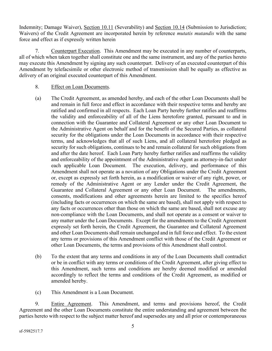 5 sf-5982517.7 Indemnity; Damage Waiver), Section 10.11 (Severability) and Section 10.14 (Submission to Jurisdiction; Waivers) of the Credit Agreement are incorporated herein by reference mutatis mutandis with the same force and effect as if expressly written herein 7. Counterpart Execution. This Amendment may be executed in any number of counterparts, all of which when taken together shall constitute one and the same instrument, and any of the parties hereto may execute this Amendment by signing any such counterpart. Delivery of an executed counterpart of this Amendment by telefacsimile or other electronic method of transmission shall be equally as effective as delivery of an original executed counterpart of this Amendment. 8. Effect on Loan Documents. (a) The Credit Agreement, as amended hereby, and each of the other Loan Documents shall be and remain in full force and effect in accordance with their respective terms and hereby are ratified and confirmed in all respects. Each Loan Party hereby further ratifies and reaffirms the validity and enforceability of all of the Liens heretofore granted, pursuant to and in connection with the Guarantee and Collateral Agreement or any other Loan Document to the Administrative Agent on behalf and for the benefit of the Secured Parties, as collateral security for the obligations under the Loan Documents in accordance with their respective terms, and acknowledges that all of such Liens, and all collateral heretofore pledged as security for such obligations, continues to be and remain collateral for such obligations from and after the date hereof. Each Loan Party hereby further ratifies and reaffirms the validity and enforceability of the appointment of the Administrative Agent as attorney-in-fact under each applicable Loan Document. The execution, delivery, and performance of this Amendment shall not operate as a novation of any Obligations under the Credit Agreement or, except as expressly set forth herein, as a modification or waiver of any right, power, or remedy of the Administrative Agent or any Lender under the Credit Agreement, the Guarantee and Collateral Agreement or any other Loan Document. The amendments, consents, modifications and other agreements herein are limited to the specifics hereof (including facts or occurrences on which the same are based), shall not apply with respect to any facts or occurrences other than those on which the same are based, shall not excuse any non-compliance with the Loan Documents, and shall not operate as a consent or waiver to any matter under the Loan Documents. Except for the amendments to the Credit Agreement expressly set forth herein, the Credit Agreement, the Guarantee and Collateral Agreement and other Loan Documents shall remain unchanged and in full force and effect. To the extent any terms or provisions of this Amendment conflict with those of the Credit Agreement or other Loan Documents, the terms and provisions of this Amendment shall control. (b) To the extent that any terms and conditions in any of the Loan Documents shall contradict or be in conflict with any terms or conditions of the Credit Agreement, after giving effect to this Amendment, such terms and conditions are hereby deemed modified or amended accordingly to reflect the terms and conditions of the Credit Agreement, as modified or amended hereby. (c) This Amendment is a Loan Document. 9. Entire Agreement. This Amendment, and terms and provisions hereof, the Credit Agreement and the other Loan Documents constitute the entire understanding and agreement between the parties hereto with respect to the subject matter hereof and supersedes any and all prior or contemporaneous