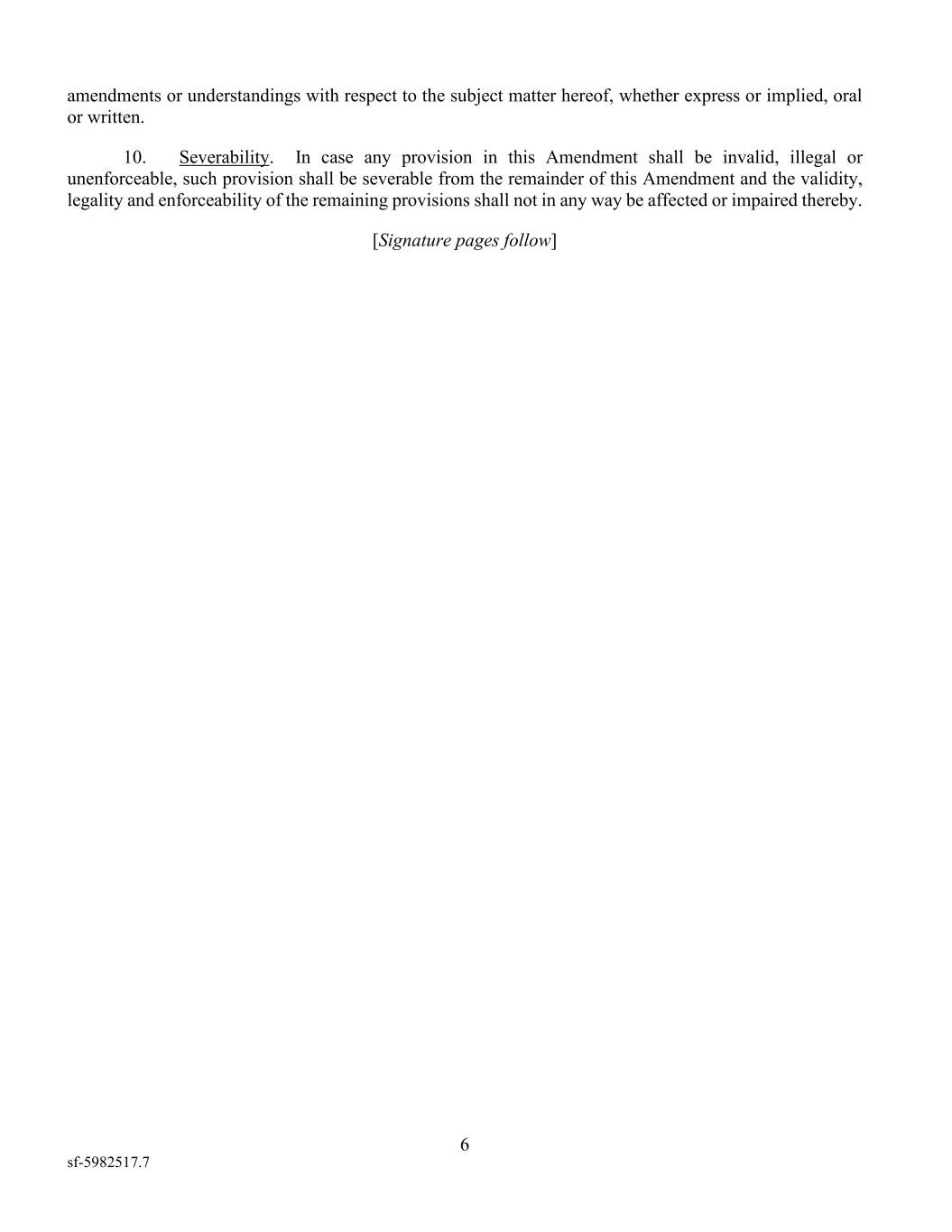6 sf-5982517.7 amendments or understandings with respect to the subject matter hereof, whether express or implied, oral or written. 10. Severability. In case any provision in this Amendment shall be invalid, illegal or unenforceable, such provision shall be severable from the remainder of this Amendment and the validity, legality and enforceability of the remaining provisions shall not in any way be affected or impaired thereby. [Signature pages follow]