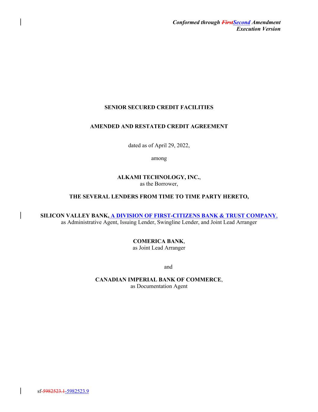 Conformed through FirstSecond Amendment Execution Version sf-5982523.1-5982523.9 SENIOR SECURED CREDIT FACILITIES AMENDED AND RESTATED CREDIT AGREEMENT dated as of April 29, 2022, among ALKAMI TECHNOLOGY, INC., as the Borrower, THE SEVERAL LENDERS FROM TIME TO TIME PARTY HERETO, SILICON VALLEY BANK, A DIVISION OF FIRST-CITIZENS BANK & TRUST COMPANY, as Administrative Agent, Issuing Lender, Swingline Lender, and Joint Lead Arranger COMERICA BANK, as Joint Lead Arranger and CANADIAN IMPERIAL BANK OF COMMERCE, as Documentation Agent
