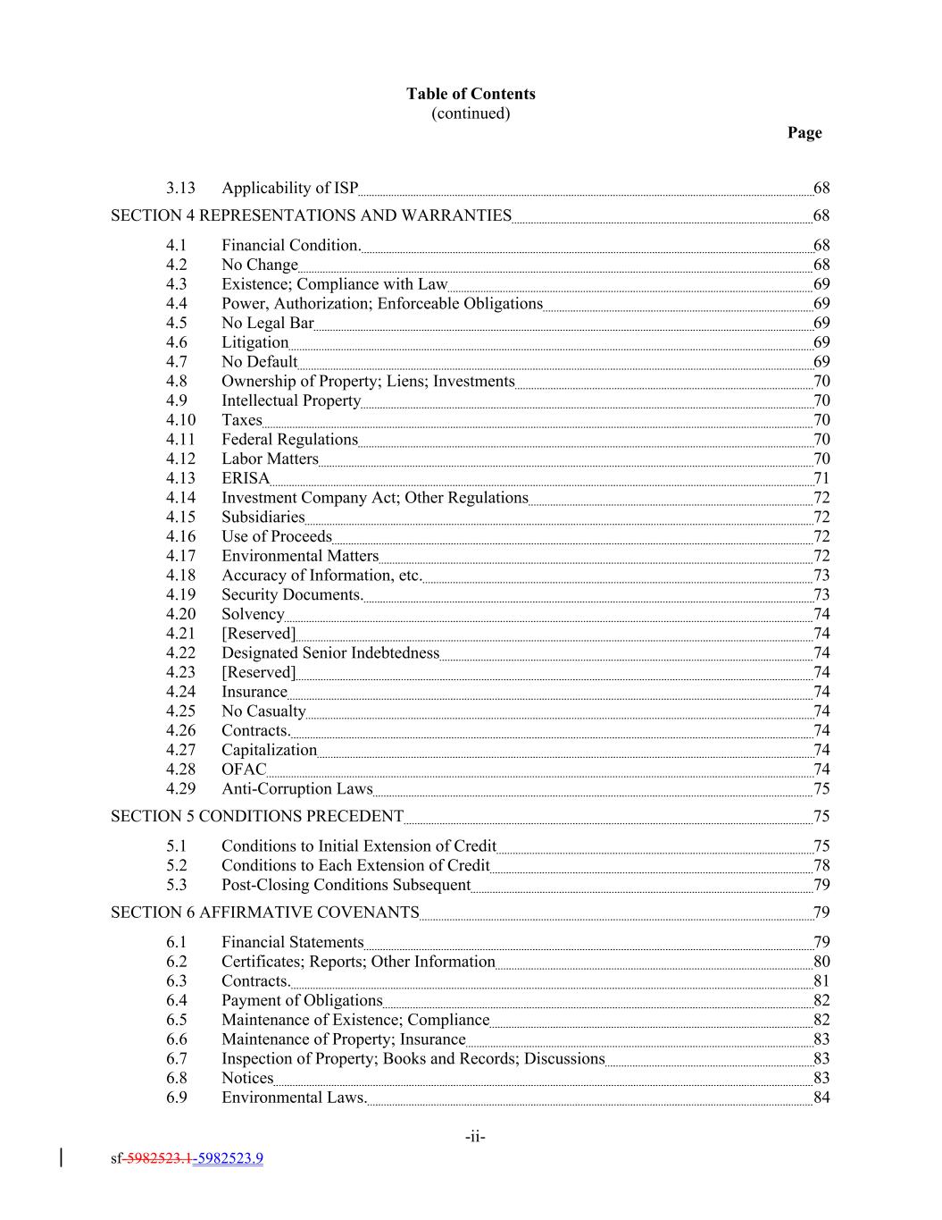 Table of Contents (continued) Page -ii- sf-5982523.1-5982523.9 3.13 Applicability of ISP 68 SECTION 4 REPRESENTATIONS AND WARRANTIES 68 4.1 Financial Condition. 68 4.2 No Change 68 4.3 Existence; Compliance with Law 69 4.4 Power, Authorization; Enforceable Obligations 69 4.5 No Legal Bar 69 4.6 Litigation 69 4.7 No Default 69 4.8 Ownership of Property; Liens; Investments 70 4.9 Intellectual Property 70 4.10 Taxes 70 4.11 Federal Regulations 70 4.12 Labor Matters 70 4.13 ERISA 71 4.14 Investment Company Act; Other Regulations 72 4.15 Subsidiaries 72 4.16 Use of Proceeds 72 4.17 Environmental Matters 72 4.18 Accuracy of Information, etc. 73 4.19 Security Documents. 73 4.20 Solvency 74 4.21 [Reserved] 74 4.22 Designated Senior Indebtedness 74 4.23 [Reserved] 74 4.24 Insurance 74 4.25 No Casualty 74 4.26 Contracts. 74 4.27 Capitalization 74 4.28 OFAC 74 4.29 Anti-Corruption Laws 75 SECTION 5 CONDITIONS PRECEDENT 75 5.1 Conditions to Initial Extension of Credit 75 5.2 Conditions to Each Extension of Credit 78 5.3 Post-Closing Conditions Subsequent 79 SECTION 6 AFFIRMATIVE COVENANTS 79 6.1 Financial Statements 79 6.2 Certificates; Reports; Other Information 80 6.3 Contracts. 81 6.4 Payment of Obligations 82 6.5 Maintenance of Existence; Compliance 82 6.6 Maintenance of Property; Insurance 83 6.7 Inspection of Property; Books and Records; Discussions 83 6.8 Notices 83 6.9 Environmental Laws. 84