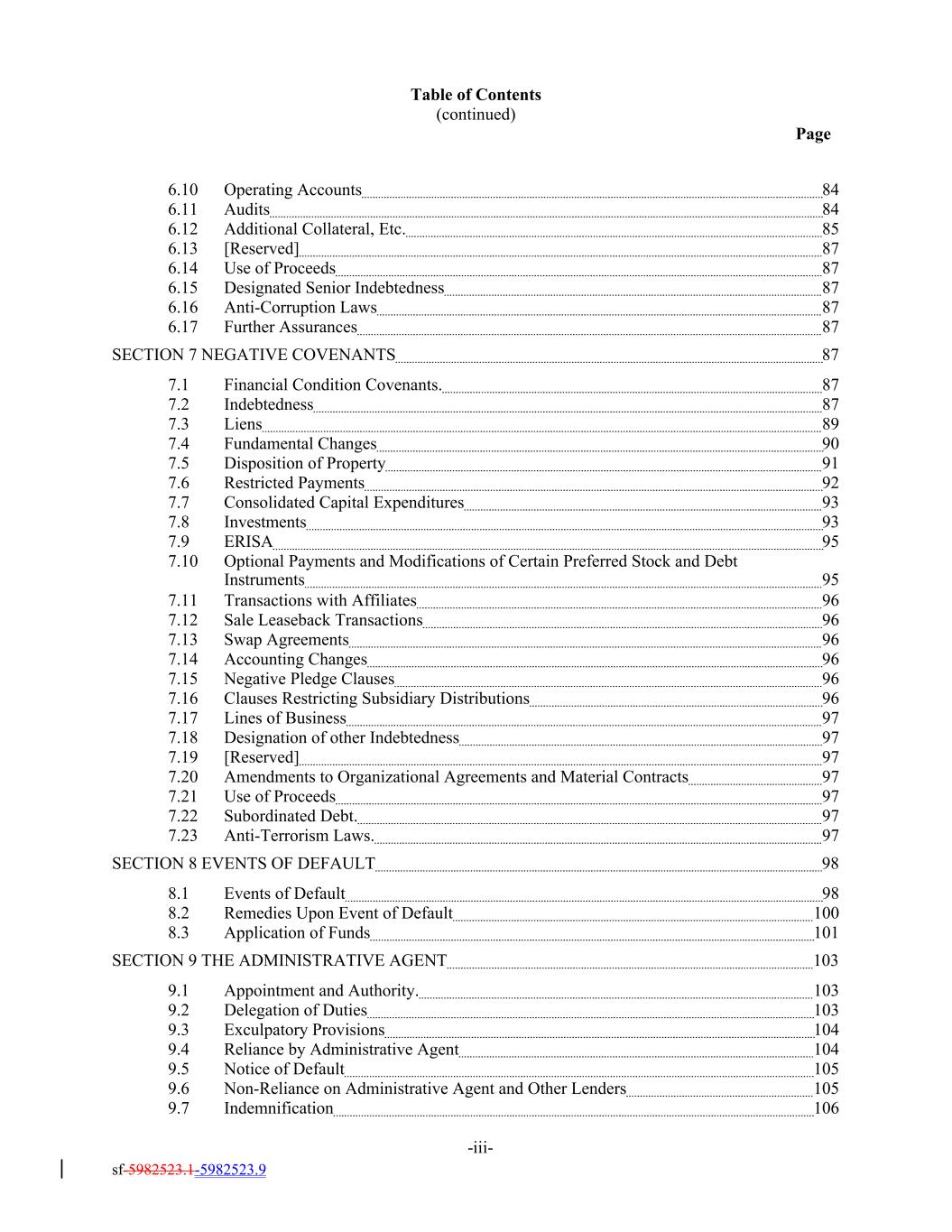 Table of Contents (continued) Page -iii- sf-5982523.1-5982523.9 6.10 Operating Accounts 84 6.11 Audits 84 6.12 Additional Collateral, Etc. 85 6.13 [Reserved] 87 6.14 Use of Proceeds 87 6.15 Designated Senior Indebtedness 87 6.16 Anti-Corruption Laws 87 6.17 Further Assurances 87 SECTION 7 NEGATIVE COVENANTS 87 7.1 Financial Condition Covenants. 87 7.2 Indebtedness 87 7.3 Liens 89 7.4 Fundamental Changes 90 7.5 Disposition of Property 91 7.6 Restricted Payments 92 7.7 Consolidated Capital Expenditures 93 7.8 Investments 93 7.9 ERISA 95 7.10 Optional Payments and Modifications of Certain Preferred Stock and Debt Instruments 95 7.11 Transactions with Affiliates 96 7.12 Sale Leaseback Transactions 96 7.13 Swap Agreements 96 7.14 Accounting Changes 96 7.15 Negative Pledge Clauses 96 7.16 Clauses Restricting Subsidiary Distributions 96 7.17 Lines of Business 97 7.18 Designation of other Indebtedness 97 7.19 [Reserved] 97 7.20 Amendments to Organizational Agreements and Material Contracts 97 7.21 Use of Proceeds 97 7.22 Subordinated Debt. 97 7.23 Anti-Terrorism Laws. 97 SECTION 8 EVENTS OF DEFAULT 98 8.1 Events of Default 98 8.2 Remedies Upon Event of Default 100 8.3 Application of Funds 101 SECTION 9 THE ADMINISTRATIVE AGENT 103 9.1 Appointment and Authority. 103 9.2 Delegation of Duties 103 9.3 Exculpatory Provisions 104 9.4 Reliance by Administrative Agent 104 9.5 Notice of Default 105 9.6 Non-Reliance on Administrative Agent and Other Lenders 105 9.7 Indemnification 106