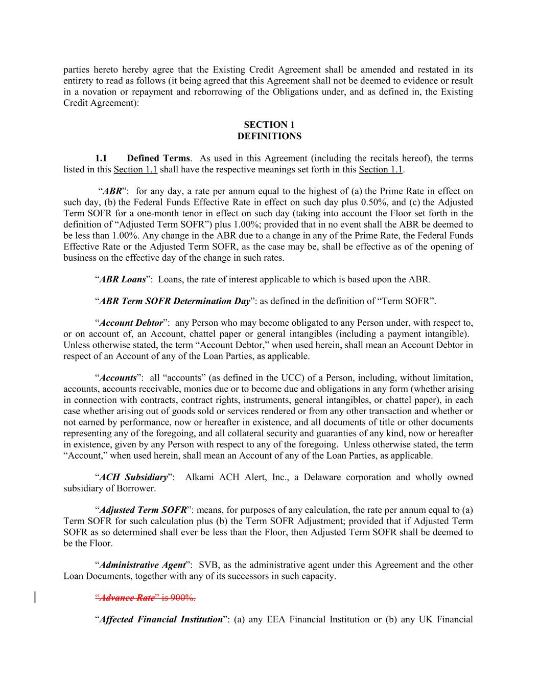 parties hereto hereby agree that the Existing Credit Agreement shall be amended and restated in its entirety to read as follows (it being agreed that this Agreement shall not be deemed to evidence or result in a novation or repayment and reborrowing of the Obligations under, and as defined in, the Existing Credit Agreement): SECTION 1 DEFINITIONS 1.1 Defined Terms. As used in this Agreement (including the recitals hereof), the terms listed in this Section 1.1 shall have the respective meanings set forth in this Section 1.1. “ABR”: for any day, a rate per annum equal to the highest of (a) the Prime Rate in effect on such day, (b) the Federal Funds Effective Rate in effect on such day plus 0.50%, and (c) the Adjusted Term SOFR for a one-month tenor in effect on such day (taking into account the Floor set forth in the definition of “Adjusted Term SOFR”) plus 1.00%; provided that in no event shall the ABR be deemed to be less than 1.00%. Any change in the ABR due to a change in any of the Prime Rate, the Federal Funds Effective Rate or the Adjusted Term SOFR, as the case may be, shall be effective as of the opening of business on the effective day of the change in such rates. “ABR Loans”: Loans, the rate of interest applicable to which is based upon the ABR. “ABR Term SOFR Determination Day”: as defined in the definition of “Term SOFR”. “Account Debtor”: any Person who may become obligated to any Person under, with respect to, or on account of, an Account, chattel paper or general intangibles (including a payment intangible). Unless otherwise stated, the term “Account Debtor,” when used herein, shall mean an Account Debtor in respect of an Account of any of the Loan Parties, as applicable. “Accounts”: all “accounts” (as defined in the UCC) of a Person, including, without limitation, accounts, accounts receivable, monies due or to become due and obligations in any form (whether arising in connection with contracts, contract rights, instruments, general intangibles, or chattel paper), in each case whether arising out of goods sold or services rendered or from any other transaction and whether or not earned by performance, now or hereafter in existence, and all documents of title or other documents representing any of the foregoing, and all collateral security and guaranties of any kind, now or hereafter in existence, given by any Person with respect to any of the foregoing. Unless otherwise stated, the term “Account,” when used herein, shall mean an Account of any of the Loan Parties, as applicable. “ACH Subsidiary”: Alkami ACH Alert, Inc., a Delaware corporation and wholly owned subsidiary of Borrower. “Adjusted Term SOFR”: means, for purposes of any calculation, the rate per annum equal to (a) Term SOFR for such calculation plus (b) the Term SOFR Adjustment; provided that if Adjusted Term SOFR as so determined shall ever be less than the Floor, then Adjusted Term SOFR shall be deemed to be the Floor. “Administrative Agent”: SVB, as the administrative agent under this Agreement and the other Loan Documents, together with any of its successors in such capacity. “Advance Rate” is 900%. “Affected Financial Institution”: (a) any EEA Financial Institution or (b) any UK Financial
