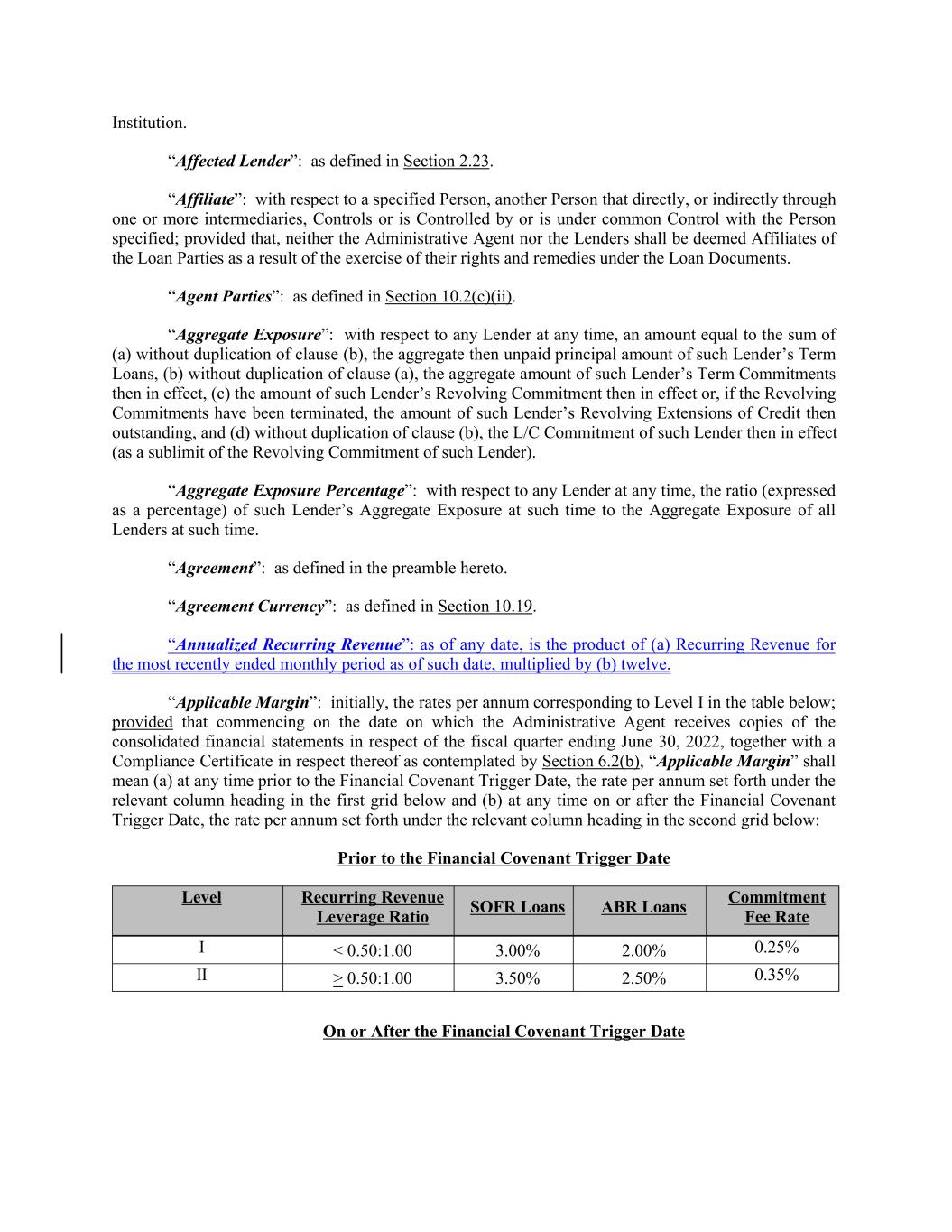< 0.50:1.00 Institution. “Affected Lender”: as defined in Section 2.23. “Affiliate”: with respect to a specified Person, another Person that directly, or indirectly through one or more intermediaries, Controls or is Controlled by or is under common Control with the Person specified; provided that, neither the Administrative Agent nor the Lenders shall be deemed Affiliates of the Loan Parties as a result of the exercise of their rights and remedies under the Loan Documents. “Agent Parties”: as defined in Section 10.2(c)(ii). “Aggregate Exposure”: with respect to any Lender at any time, an amount equal to the sum of (a) without duplication of clause (b), the aggregate then unpaid principal amount of such Lender’s Term Loans, (b) without duplication of clause (a), the aggregate amount of such Lender’s Term Commitments then in effect, (c) the amount of such Lender’s Revolving Commitment then in effect or, if the Revolving Commitments have been terminated, the amount of such Lender’s Revolving Extensions of Credit then outstanding, and (d) without duplication of clause (b), the L/C Commitment of such Lender then in effect (as a sublimit of the Revolving Commitment of such Lender). “Aggregate Exposure Percentage”: with respect to any Lender at any time, the ratio (expressed as a percentage) of such Lender’s Aggregate Exposure at such time to the Aggregate Exposure of all Lenders at such time. “Agreement”: as defined in the preamble hereto. “Agreement Currency”: as defined in Section 10.19. “Annualized Recurring Revenue”: as of any date, is the product of (a) Recurring Revenue for the most recently ended monthly period as of such date, multiplied by (b) twelve. “Applicable Margin”: initially, the rates per annum corresponding to Level I in the table below; provided that commencing on the date on which the Administrative Agent receives copies of the consolidated financial statements in respect of the fiscal quarter ending June 30, 2022, together with a Compliance Certificate in respect thereof as contemplated by Section 6.2(b), “Applicable Margin” shall mean (a) at any time prior to the Financial Covenant Trigger Date, the rate per annum set forth under the relevant column heading in the first grid below and (b) at any time on or after the Financial Covenant Trigger Date, the rate per annum set forth under the relevant column heading in the second grid below: Prior to the Financial Covenant Trigger Date 3.00% SOFR Loans 2.00% 0.25% ABR Loans II Commitment Fee Rate > 0.50:1.00 Level 3.50% 2.50% 0.35% I On or After the Financial Covenant Trigger Date Recurring Revenue Leverage Ratio
