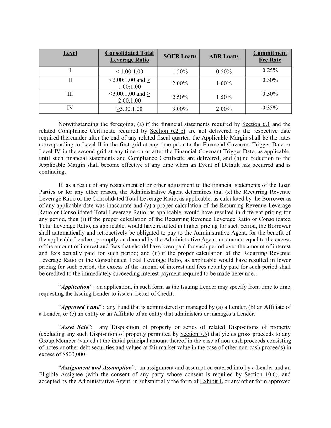 <2.00:1.00 and > 1.00:1.00 Level 2.00% 1.00% 0.30% I Consolidated Total Leverage Ratio III < 1.00:1.00 <3.00:1.00 and > 2.00:1.00 2.50% 1.50% 1.50% SOFR Loans 0.30% 0.50% IV 0.25% >3.00:1.00 ABR Loans 3.00% 2.00% 0.35% II Notwithstanding the foregoing, (a) if the financial statements required by Section 6.1 and the related Compliance Certificate required by Section 6.2(b) are not delivered by the respective date required thereunder after the end of any related fiscal quarter, the Applicable Margin shall be the rates corresponding to Level II in the first grid at any time prior to the Financial Covenant Trigger Date or Level IV in the second grid at any time on or after the Financial Covenant Trigger Date, as applicable, until such financial statements and Compliance Certificate are delivered, and (b) no reduction to the Applicable Margin shall become effective at any time when an Event of Default has occurred and is continuing. If, as a result of any restatement of or other adjustment to the financial statements of the Loan Parties or for any other reason, the Administrative Agent determines that (x) the Recurring Revenue Leverage Ratio or the Consolidated Total Leverage Ratio, as applicable, as calculated by the Borrower as of any applicable date was inaccurate and (y) a proper calculation of the Recurring Revenue Leverage Ratio or Consolidated Total Leverage Ratio, as applicable, would have resulted in different pricing for any period, then (i) if the proper calculation of the Recurring Revenue Leverage Ratio or Consolidated Total Leverage Ratio, as applicable, would have resulted in higher pricing for such period, the Borrower shall automatically and retroactively be obligated to pay to the Administrative Agent, for the benefit of the applicable Lenders, promptly on demand by the Administrative Agent, an amount equal to the excess of the amount of interest and fees that should have been paid for such period over the amount of interest and fees actually paid for such period; and (ii) if the proper calculation of the Recurring Revenue Leverage Ratio or the Consolidated Total Leverage Ratio, as applicable would have resulted in lower pricing for such period, the excess of the amount of interest and fees actually paid for such period shall be credited to the immediately succeeding interest payment required to be made hereunder. “Application”: an application, in such form as the Issuing Lender may specify from time to time, requesting the Issuing Lender to issue a Letter of Credit. “Approved Fund”: any Fund that is administered or managed by (a) a Lender, (b) an Affiliate of a Lender, or (c) an entity or an Affiliate of an entity that administers or manages a Lender. “Asset Sale”: any Disposition of property or series of related Dispositions of property (excluding any such Disposition of property permitted by Section 7.5) that yields gross proceeds to any Group Member (valued at the initial principal amount thereof in the case of non-cash proceeds consisting of notes or other debt securities and valued at fair market value in the case of other non-cash proceeds) in excess of $500,000. “Assignment and Assumption”: an assignment and assumption entered into by a Lender and an Eligible Assignee (with the consent of any party whose consent is required by Section 10.6), and accepted by the Administrative Agent, in substantially the form of Exhibit E or any other form approved Commitment Fee Rate