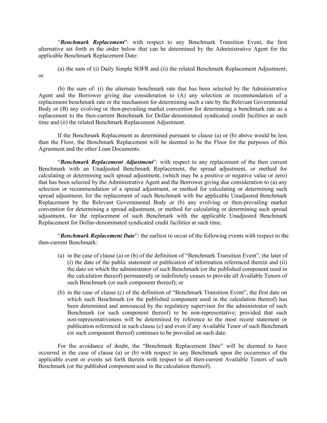“Benchmark Replacement”: with respect to any Benchmark Transition Event, the first alternative set forth in the order below that can be determined by the Administrative Agent for the applicable Benchmark Replacement Date: (a) the sum of (i) Daily Simple SOFR and (ii) the related Benchmark Replacement Adjustment; or (b) the sum of: (i) the alternate benchmark rate that has been selected by the Administrative Agent and the Borrower giving due consideration to (A) any selection or recommendation of a replacement benchmark rate or the mechanism for determining such a rate by the Relevant Governmental Body or (B) any evolving or then-prevailing market convention for determining a benchmark rate as a replacement to the then-current Benchmark for Dollar-denominated syndicated credit facilities at such time and (ii) the related Benchmark Replacement Adjustment. If the Benchmark Replacement as determined pursuant to clause (a) or (b) above would be less than the Floor, the Benchmark Replacement will be deemed to be the Floor for the purposes of this Agreement and the other Loan Documents. “Benchmark Replacement Adjustment”: with respect to any replacement of the then current Benchmark with an Unadjusted Benchmark Replacement, the spread adjustment, or method for calculating or determining such spread adjustment, (which may be a positive or negative value or zero) that has been selected by the Administrative Agent and the Borrower giving due consideration to (a) any selection or recommendation of a spread adjustment, or method for calculating or determining such spread adjustment, for the replacement of such Benchmark with the applicable Unadjusted Benchmark Replacement by the Relevant Governmental Body or (b) any evolving or then-prevailing market convention for determining a spread adjustment, or method for calculating or determining such spread adjustment, for the replacement of such Benchmark with the applicable Unadjusted Benchmark Replacement for Dollar-denominated syndicated credit facilities at such time. “Benchmark Replacement Date”: the earliest to occur of the following events with respect to the then-current Benchmark: (a) in the case of clause (a) or (b) of the definition of “Benchmark Transition Event”, the later of (i) the date of the public statement or publication of information referenced therein and (ii) the date on which the administrator of such Benchmark (or the published component used in the calculation thereof) permanently or indefinitely ceases to provide all Available Tenors of such Benchmark (or such component thereof); or (b) in the case of clause (c) of the definition of “Benchmark Transition Event”, the first date on which such Benchmark (or the published component used in the calculation thereof) has been determined and announced by the regulatory supervisor for the administrator of such Benchmark (or such component thereof) to be non-representative; provided that such non-representativeness will be determined by reference to the most recent statement or publication referenced in such clause (c) and even if any Available Tenor of such Benchmark (or such component thereof) continues to be provided on such date. For the avoidance of doubt, the “Benchmark Replacement Date” will be deemed to have occurred in the case of clause (a) or (b) with respect to any Benchmark upon the occurrence of the applicable event or events set forth therein with respect to all then-current Available Tenors of such Benchmark (or the published component used in the calculation thereof).