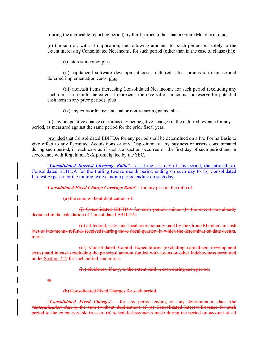 (during the applicable reporting period) by third parties (other than a Group Member); minus (c) the sum of, without duplication, the following amounts for such period but solely to the extent increasing Consolidated Net Income for such period (other than in the case of clause (ii)): (i) interest income; plus (ii) capitalized software development costs, deferred sales commission expense and deferred implementation costs; plus (iii) noncash items increasing Consolidated Net Income for such period (excluding any such noncash item to the extent it represents the reversal of an accrual or reserve for potential cash item in any prior period); plus (iv) any extraordinary, unusual or non-recurring gains, plus (d) any net positive change (or minus any net negative change) in the deferred revenue for any period, as measured against the same period for the prior fiscal year; provided that Consolidated EBITDA for any period shall be determined on a Pro Forma Basis to give effect to any Permitted Acquisitions or any Disposition of any business or assets consummated during such period, in each case as if such transaction occurred on the first day of such period and in accordance with Regulation S-X promulgated by the SEC. “Consolidated Interest Coverage Ratio”: as at the last day of any period, the ratio of (a) Consolidated EBITDA for the trailing twelve month period ending on such day to (b) Consolidated Interest Expense for the trailing twelve month period ending on such day. “Consolidated Fixed Charge Coverage Ratio”: for any period, the ratio of: (a) the sum, without duplication, of: (i) Consolidated EBITDA for such period, minus (to the extent not already deducted in the calculation of Consolidated EBITDA) (ii) all federal, state, and local taxes actually paid by the Group Members in cash (net of income tax refunds received) during those fiscal quarters in which the determination date occurs, minus (iii) Consolidated Capital Expenditures (excluding capitalized development costs) paid in cash (excluding the principal amount funded with Loans or other Indebtedness permitted under Section 7.2) for such period, and minus (iv) dividends, if any, to the extent paid in cash during such period; to (b) Consolidated Fixed Charges for such period. “Consolidated Fixed Charges”: for any period ending on any determination date (the “determination date”), the sum (without duplication) of (a) Consolidated Interest Expense for such period to the extent payable in cash, (b) scheduled payments made during the period on account of all