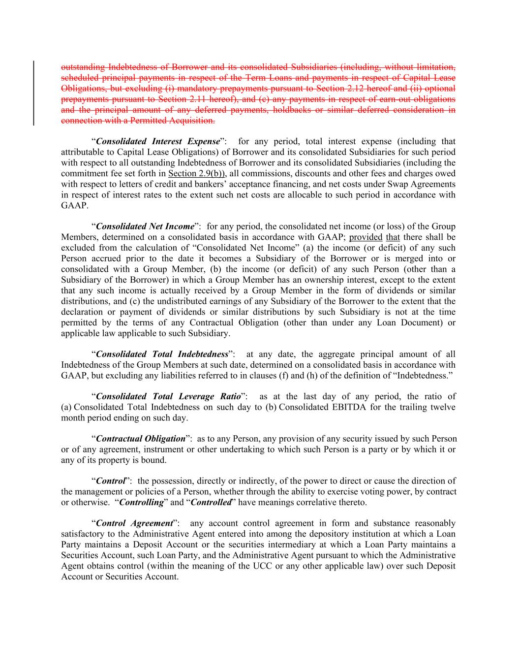 outstanding Indebtedness of Borrower and its consolidated Subsidiaries (including, without limitation, scheduled principal payments in respect of the Term Loans and payments in respect of Capital Lease Obligations, but excluding (i) mandatory prepayments pursuant to Section 2.12 hereof and (ii) optional prepayments pursuant to Section 2.11 hereof), and (c) any payments in respect of earn-out obligations and the principal amount of any deferred payments, holdbacks or similar deferred consideration in connection with a Permitted Acquisition. “Consolidated Interest Expense”: for any period, total interest expense (including that attributable to Capital Lease Obligations) of Borrower and its consolidated Subsidiaries for such period with respect to all outstanding Indebtedness of Borrower and its consolidated Subsidiaries (including the commitment fee set forth in Section 2.9(b)), all commissions, discounts and other fees and charges owed with respect to letters of credit and bankers’ acceptance financing, and net costs under Swap Agreements in respect of interest rates to the extent such net costs are allocable to such period in accordance with GAAP. “Consolidated Net Income”: for any period, the consolidated net income (or loss) of the Group Members, determined on a consolidated basis in accordance with GAAP; provided that there shall be excluded from the calculation of “Consolidated Net Income” (a) the income (or deficit) of any such Person accrued prior to the date it becomes a Subsidiary of the Borrower or is merged into or consolidated with a Group Member, (b) the income (or deficit) of any such Person (other than a Subsidiary of the Borrower) in which a Group Member has an ownership interest, except to the extent that any such income is actually received by a Group Member in the form of dividends or similar distributions, and (c) the undistributed earnings of any Subsidiary of the Borrower to the extent that the declaration or payment of dividends or similar distributions by such Subsidiary is not at the time permitted by the terms of any Contractual Obligation (other than under any Loan Document) or applicable law applicable to such Subsidiary. “Consolidated Total Indebtedness”: at any date, the aggregate principal amount of all Indebtedness of the Group Members at such date, determined on a consolidated basis in accordance with GAAP, but excluding any liabilities referred to in clauses (f) and (h) of the definition of “Indebtedness.” “Consolidated Total Leverage Ratio”: as at the last day of any period, the ratio of (a) Consolidated Total Indebtedness on such day to (b) Consolidated EBITDA for the trailing twelve month period ending on such day. “Contractual Obligation”: as to any Person, any provision of any security issued by such Person or of any agreement, instrument or other undertaking to which such Person is a party or by which it or any of its property is bound. “Control”: the possession, directly or indirectly, of the power to direct or cause the direction of the management or policies of a Person, whether through the ability to exercise voting power, by contract or otherwise. “Controlling” and “Controlled” have meanings correlative thereto. “Control Agreement”: any account control agreement in form and substance reasonably satisfactory to the Administrative Agent entered into among the depository institution at which a Loan Party maintains a Deposit Account or the securities intermediary at which a Loan Party maintains a Securities Account, such Loan Party, and the Administrative Agent pursuant to which the Administrative Agent obtains control (within the meaning of the UCC or any other applicable law) over such Deposit Account or Securities Account.