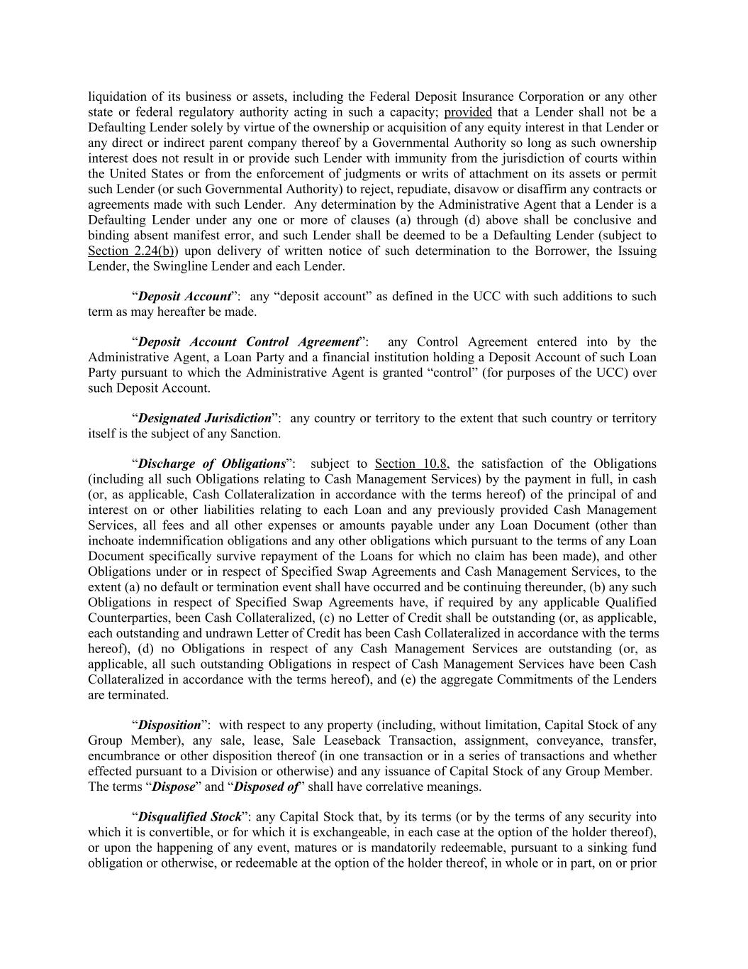 liquidation of its business or assets, including the Federal Deposit Insurance Corporation or any other state or federal regulatory authority acting in such a capacity; provided that a Lender shall not be a Defaulting Lender solely by virtue of the ownership or acquisition of any equity interest in that Lender or any direct or indirect parent company thereof by a Governmental Authority so long as such ownership interest does not result in or provide such Lender with immunity from the jurisdiction of courts within the United States or from the enforcement of judgments or writs of attachment on its assets or permit such Lender (or such Governmental Authority) to reject, repudiate, disavow or disaffirm any contracts or agreements made with such Lender. Any determination by the Administrative Agent that a Lender is a Defaulting Lender under any one or more of clauses (a) through (d) above shall be conclusive and binding absent manifest error, and such Lender shall be deemed to be a Defaulting Lender (subject to Section 2.24(b)) upon delivery of written notice of such determination to the Borrower, the Issuing Lender, the Swingline Lender and each Lender. “Deposit Account”: any “deposit account” as defined in the UCC with such additions to such term as may hereafter be made. “Deposit Account Control Agreement”: any Control Agreement entered into by the Administrative Agent, a Loan Party and a financial institution holding a Deposit Account of such Loan Party pursuant to which the Administrative Agent is granted “control” (for purposes of the UCC) over such Deposit Account. “Designated Jurisdiction”: any country or territory to the extent that such country or territory itself is the subject of any Sanction. “Discharge of Obligations”: subject to Section 10.8, the satisfaction of the Obligations (including all such Obligations relating to Cash Management Services) by the payment in full, in cash (or, as applicable, Cash Collateralization in accordance with the terms hereof) of the principal of and interest on or other liabilities relating to each Loan and any previously provided Cash Management Services, all fees and all other expenses or amounts payable under any Loan Document (other than inchoate indemnification obligations and any other obligations which pursuant to the terms of any Loan Document specifically survive repayment of the Loans for which no claim has been made), and other Obligations under or in respect of Specified Swap Agreements and Cash Management Services, to the extent (a) no default or termination event shall have occurred and be continuing thereunder, (b) any such Obligations in respect of Specified Swap Agreements have, if required by any applicable Qualified Counterparties, been Cash Collateralized, (c) no Letter of Credit shall be outstanding (or, as applicable, each outstanding and undrawn Letter of Credit has been Cash Collateralized in accordance with the terms hereof), (d) no Obligations in respect of any Cash Management Services are outstanding (or, as applicable, all such outstanding Obligations in respect of Cash Management Services have been Cash Collateralized in accordance with the terms hereof), and (e) the aggregate Commitments of the Lenders are terminated. “Disposition”: with respect to any property (including, without limitation, Capital Stock of any Group Member), any sale, lease, Sale Leaseback Transaction, assignment, conveyance, transfer, encumbrance or other disposition thereof (in one transaction or in a series of transactions and whether effected pursuant to a Division or otherwise) and any issuance of Capital Stock of any Group Member. The terms “Dispose” and “Disposed of” shall have correlative meanings. “Disqualified Stock”: any Capital Stock that, by its terms (or by the terms of any security into which it is convertible, or for which it is exchangeable, in each case at the option of the holder thereof), or upon the happening of any event, matures or is mandatorily redeemable, pursuant to a sinking fund obligation or otherwise, or redeemable at the option of the holder thereof, in whole or in part, on or prior