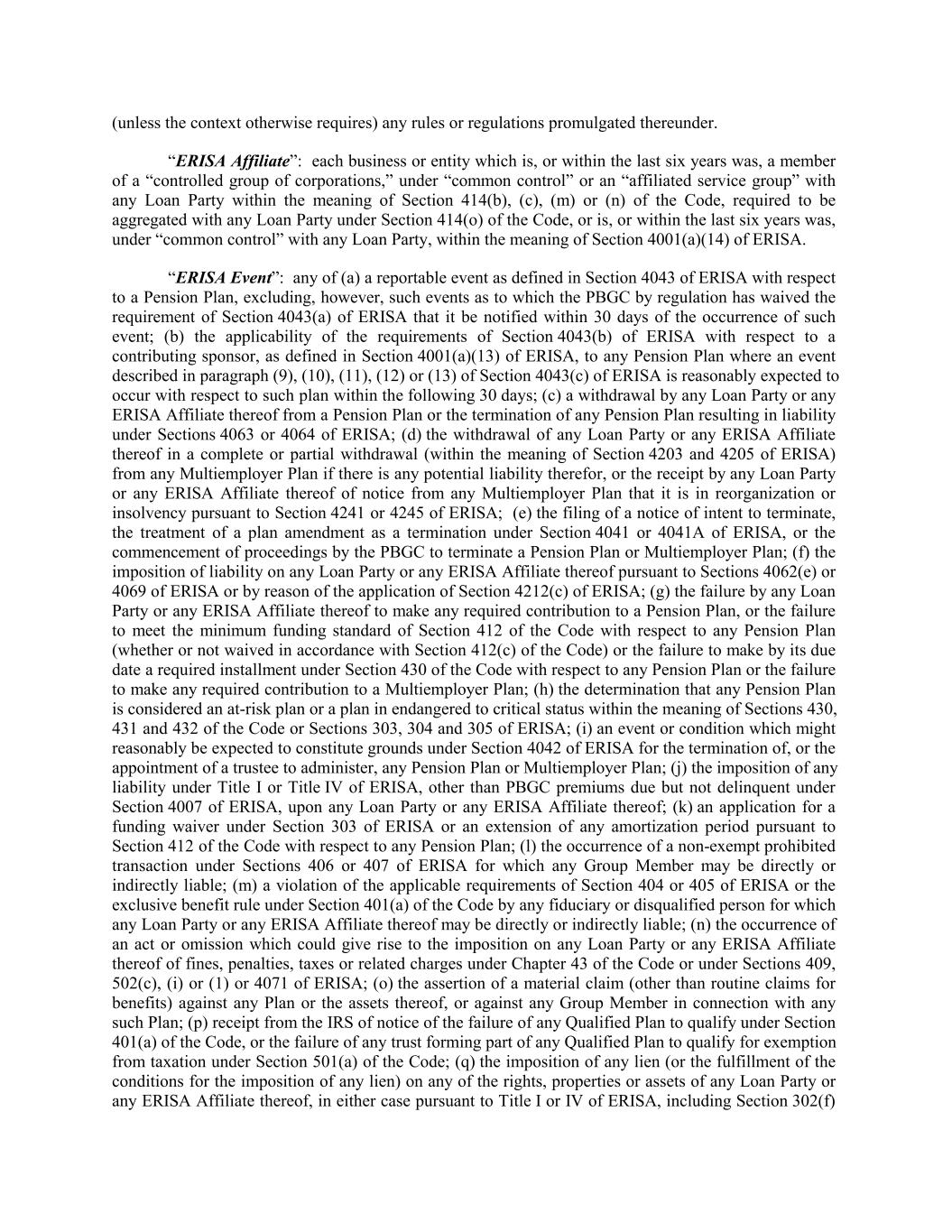 (unless the context otherwise requires) any rules or regulations promulgated thereunder. “ERISA Affiliate”: each business or entity which is, or within the last six years was, a member of a “controlled group of corporations,” under “common control” or an “affiliated service group” with any Loan Party within the meaning of Section 414(b), (c), (m) or (n) of the Code, required to be aggregated with any Loan Party under Section 414(o) of the Code, or is, or within the last six years was, under “common control” with any Loan Party, within the meaning of Section 4001(a)(14) of ERISA. “ERISA Event”: any of (a) a reportable event as defined in Section 4043 of ERISA with respect to a Pension Plan, excluding, however, such events as to which the PBGC by regulation has waived the requirement of Section 4043(a) of ERISA that it be notified within 30 days of the occurrence of such event; (b) the applicability of the requirements of Section 4043(b) of ERISA with respect to a contributing sponsor, as defined in Section 4001(a)(13) of ERISA, to any Pension Plan where an event described in paragraph (9), (10), (11), (12) or (13) of Section 4043(c) of ERISA is reasonably expected to occur with respect to such plan within the following 30 days; (c) a withdrawal by any Loan Party or any ERISA Affiliate thereof from a Pension Plan or the termination of any Pension Plan resulting in liability under Sections 4063 or 4064 of ERISA; (d) the withdrawal of any Loan Party or any ERISA Affiliate thereof in a complete or partial withdrawal (within the meaning of Section 4203 and 4205 of ERISA) from any Multiemployer Plan if there is any potential liability therefor, or the receipt by any Loan Party or any ERISA Affiliate thereof of notice from any Multiemployer Plan that it is in reorganization or insolvency pursuant to Section 4241 or 4245 of ERISA; (e) the filing of a notice of intent to terminate, the treatment of a plan amendment as a termination under Section 4041 or 4041A of ERISA, or the commencement of proceedings by the PBGC to terminate a Pension Plan or Multiemployer Plan; (f) the imposition of liability on any Loan Party or any ERISA Affiliate thereof pursuant to Sections 4062(e) or 4069 of ERISA or by reason of the application of Section 4212(c) of ERISA; (g) the failure by any Loan Party or any ERISA Affiliate thereof to make any required contribution to a Pension Plan, or the failure to meet the minimum funding standard of Section 412 of the Code with respect to any Pension Plan (whether or not waived in accordance with Section 412(c) of the Code) or the failure to make by its due date a required installment under Section 430 of the Code with respect to any Pension Plan or the failure to make any required contribution to a Multiemployer Plan; (h) the determination that any Pension Plan is considered an at-risk plan or a plan in endangered to critical status within the meaning of Sections 430, 431 and 432 of the Code or Sections 303, 304 and 305 of ERISA; (i) an event or condition which might reasonably be expected to constitute grounds under Section 4042 of ERISA for the termination of, or the appointment of a trustee to administer, any Pension Plan or Multiemployer Plan; (j) the imposition of any liability under Title I or Title IV of ERISA, other than PBGC premiums due but not delinquent under Section 4007 of ERISA, upon any Loan Party or any ERISA Affiliate thereof; (k) an application for a funding waiver under Section 303 of ERISA or an extension of any amortization period pursuant to Section 412 of the Code with respect to any Pension Plan; (l) the occurrence of a non-exempt prohibited transaction under Sections 406 or 407 of ERISA for which any Group Member may be directly or indirectly liable; (m) a violation of the applicable requirements of Section 404 or 405 of ERISA or the exclusive benefit rule under Section 401(a) of the Code by any fiduciary or disqualified person for which any Loan Party or any ERISA Affiliate thereof may be directly or indirectly liable; (n) the occurrence of an act or omission which could give rise to the imposition on any Loan Party or any ERISA Affiliate thereof of fines, penalties, taxes or related charges under Chapter 43 of the Code or under Sections 409, 502(c), (i) or (1) or 4071 of ERISA; (o) the assertion of a material claim (other than routine claims for benefits) against any Plan or the assets thereof, or against any Group Member in connection with any such Plan; (p) receipt from the IRS of notice of the failure of any Qualified Plan to qualify under Section 401(a) of the Code, or the failure of any trust forming part of any Qualified Plan to qualify for exemption from taxation under Section 501(a) of the Code; (q) the imposition of any lien (or the fulfillment of the conditions for the imposition of any lien) on any of the rights, properties or assets of any Loan Party or any ERISA Affiliate thereof, in either case pursuant to Title I or IV of ERISA, including Section 302(f)