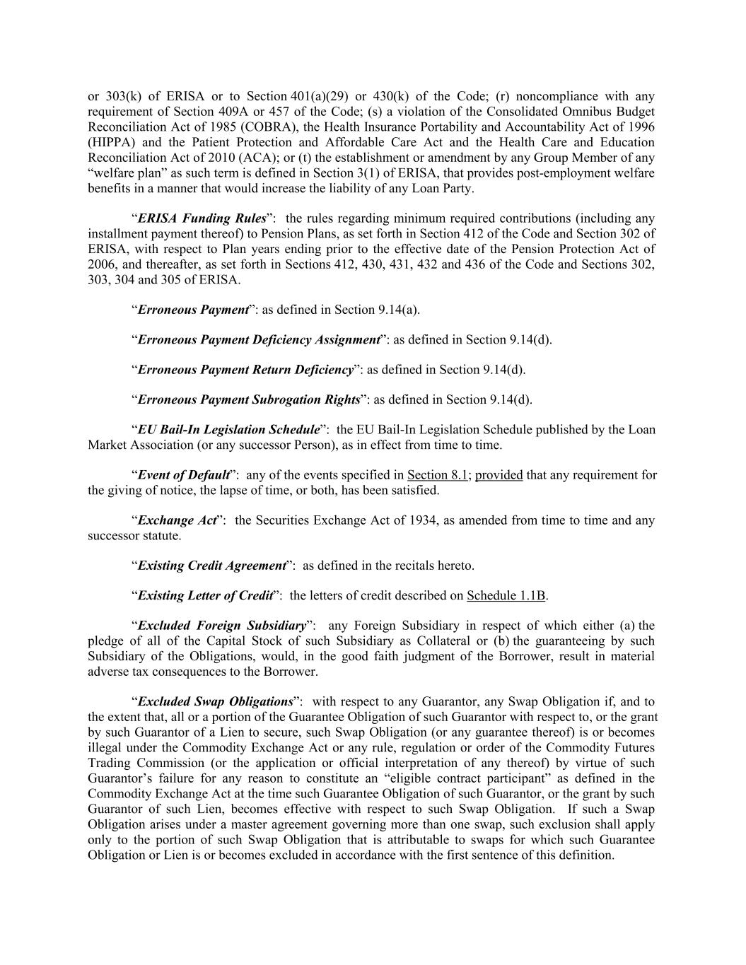 or 303(k) of ERISA or to Section 401(a)(29) or 430(k) of the Code; (r) noncompliance with any requirement of Section 409A or 457 of the Code; (s) a violation of the Consolidated Omnibus Budget Reconciliation Act of 1985 (COBRA), the Health Insurance Portability and Accountability Act of 1996 (HIPPA) and the Patient Protection and Affordable Care Act and the Health Care and Education Reconciliation Act of 2010 (ACA); or (t) the establishment or amendment by any Group Member of any “welfare plan” as such term is defined in Section 3(1) of ERISA, that provides post-employment welfare benefits in a manner that would increase the liability of any Loan Party. “ERISA Funding Rules”: the rules regarding minimum required contributions (including any installment payment thereof) to Pension Plans, as set forth in Section 412 of the Code and Section 302 of ERISA, with respect to Plan years ending prior to the effective date of the Pension Protection Act of 2006, and thereafter, as set forth in Sections 412, 430, 431, 432 and 436 of the Code and Sections 302, 303, 304 and 305 of ERISA. “Erroneous Payment”: as defined in Section 9.14(a). “Erroneous Payment Deficiency Assignment”: as defined in Section 9.14(d). “Erroneous Payment Return Deficiency”: as defined in Section 9.14(d). “Erroneous Payment Subrogation Rights”: as defined in Section 9.14(d). “EU Bail-In Legislation Schedule”: the EU Bail-In Legislation Schedule published by the Loan Market Association (or any successor Person), as in effect from time to time. “Event of Default”: any of the events specified in Section 8.1; provided that any requirement for the giving of notice, the lapse of time, or both, has been satisfied. “Exchange Act”: the Securities Exchange Act of 1934, as amended from time to time and any successor statute. “Existing Credit Agreement”: as defined in the recitals hereto. “Existing Letter of Credit”: the letters of credit described on Schedule 1.1B. “Excluded Foreign Subsidiary”: any Foreign Subsidiary in respect of which either (a) the pledge of all of the Capital Stock of such Subsidiary as Collateral or (b) the guaranteeing by such Subsidiary of the Obligations, would, in the good faith judgment of the Borrower, result in material adverse tax consequences to the Borrower. “Excluded Swap Obligations”: with respect to any Guarantor, any Swap Obligation if, and to the extent that, all or a portion of the Guarantee Obligation of such Guarantor with respect to, or the grant by such Guarantor of a Lien to secure, such Swap Obligation (or any guarantee thereof) is or becomes illegal under the Commodity Exchange Act or any rule, regulation or order of the Commodity Futures Trading Commission (or the application or official interpretation of any thereof) by virtue of such Guarantor’s failure for any reason to constitute an “eligible contract participant” as defined in the Commodity Exchange Act at the time such Guarantee Obligation of such Guarantor, or the grant by such Guarantor of such Lien, becomes effective with respect to such Swap Obligation. If such a Swap Obligation arises under a master agreement governing more than one swap, such exclusion shall apply only to the portion of such Swap Obligation that is attributable to swaps for which such Guarantee Obligation or Lien is or becomes excluded in accordance with the first sentence of this definition.