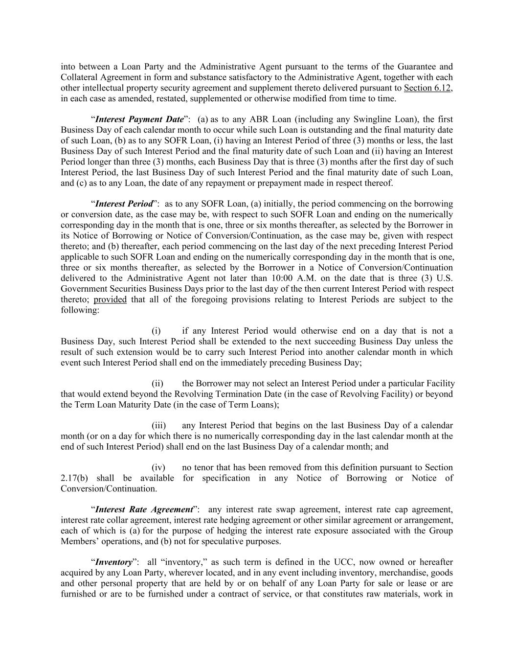 into between a Loan Party and the Administrative Agent pursuant to the terms of the Guarantee and Collateral Agreement in form and substance satisfactory to the Administrative Agent, together with each other intellectual property security agreement and supplement thereto delivered pursuant to Section 6.12, in each case as amended, restated, supplemented or otherwise modified from time to time. “Interest Payment Date”: (a) as to any ABR Loan (including any Swingline Loan), the first Business Day of each calendar month to occur while such Loan is outstanding and the final maturity date of such Loan, (b) as to any SOFR Loan, (i) having an Interest Period of three (3) months or less, the last Business Day of such Interest Period and the final maturity date of such Loan and (ii) having an Interest Period longer than three (3) months, each Business Day that is three (3) months after the first day of such Interest Period, the last Business Day of such Interest Period and the final maturity date of such Loan, and (c) as to any Loan, the date of any repayment or prepayment made in respect thereof. “Interest Period”: as to any SOFR Loan, (a) initially, the period commencing on the borrowing or conversion date, as the case may be, with respect to such SOFR Loan and ending on the numerically corresponding day in the month that is one, three or six months thereafter, as selected by the Borrower in its Notice of Borrowing or Notice of Conversion/Continuation, as the case may be, given with respect thereto; and (b) thereafter, each period commencing on the last day of the next preceding Interest Period applicable to such SOFR Loan and ending on the numerically corresponding day in the month that is one, three or six months thereafter, as selected by the Borrower in a Notice of Conversion/Continuation delivered to the Administrative Agent not later than 10:00 A.M. on the date that is three (3) U.S. Government Securities Business Days prior to the last day of the then current Interest Period with respect thereto; provided that all of the foregoing provisions relating to Interest Periods are subject to the following: (i) if any Interest Period would otherwise end on a day that is not a Business Day, such Interest Period shall be extended to the next succeeding Business Day unless the result of such extension would be to carry such Interest Period into another calendar month in which event such Interest Period shall end on the immediately preceding Business Day; (ii) the Borrower may not select an Interest Period under a particular Facility that would extend beyond the Revolving Termination Date (in the case of Revolving Facility) or beyond the Term Loan Maturity Date (in the case of Term Loans); (iii) any Interest Period that begins on the last Business Day of a calendar month (or on a day for which there is no numerically corresponding day in the last calendar month at the end of such Interest Period) shall end on the last Business Day of a calendar month; and (iv) no tenor that has been removed from this definition pursuant to Section 2.17(b) shall be available for specification in any Notice of Borrowing or Notice of Conversion/Continuation. “Interest Rate Agreement”: any interest rate swap agreement, interest rate cap agreement, interest rate collar agreement, interest rate hedging agreement or other similar agreement or arrangement, each of which is (a) for the purpose of hedging the interest rate exposure associated with the Group Members’ operations, and (b) not for speculative purposes. “Inventory”: all “inventory,” as such term is defined in the UCC, now owned or hereafter acquired by any Loan Party, wherever located, and in any event including inventory, merchandise, goods and other personal property that are held by or on behalf of any Loan Party for sale or lease or are furnished or are to be furnished under a contract of service, or that constitutes raw materials, work in
