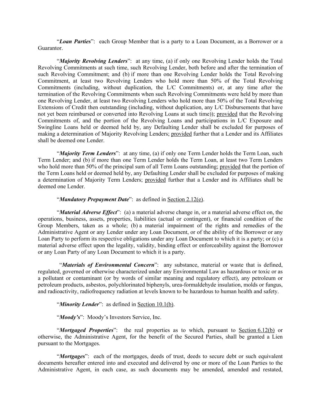 “Loan Parties”: each Group Member that is a party to a Loan Document, as a Borrower or a Guarantor. “Majority Revolving Lenders”: at any time, (a) if only one Revolving Lender holds the Total Revolving Commitments at such time, such Revolving Lender, both before and after the termination of such Revolving Commitment; and (b) if more than one Revolving Lender holds the Total Revolving Commitment, at least two Revolving Lenders who hold more than 50% of the Total Revolving Commitments (including, without duplication, the L/C Commitments) or, at any time after the termination of the Revolving Commitments when such Revolving Commitments were held by more than one Revolving Lender, at least two Revolving Lenders who hold more than 50% of the Total Revolving Extensions of Credit then outstanding (including, without duplication, any L/C Disbursements that have not yet been reimbursed or converted into Revolving Loans at such time)); provided that the Revolving Commitments of, and the portion of the Revolving Loans and participations in L/C Exposure and Swingline Loans held or deemed held by, any Defaulting Lender shall be excluded for purposes of making a determination of Majority Revolving Lenders; provided further that a Lender and its Affiliates shall be deemed one Lender. “Majority Term Lenders”: at any time, (a) if only one Term Lender holds the Term Loan, such Term Lender; and (b) if more than one Term Lender holds the Term Loan, at least two Term Lenders who hold more than 50% of the principal sum of all Term Loans outstanding; provided that the portion of the Term Loans held or deemed held by, any Defaulting Lender shall be excluded for purposes of making a determination of Majority Term Lenders; provided further that a Lender and its Affiliates shall be deemed one Lender. “Mandatory Prepayment Date”: as defined in Section 2.12(e). “Material Adverse Effect”: (a) a material adverse change in, or a material adverse effect on, the operations, business, assets, properties, liabilities (actual or contingent), or financial condition of the Group Members, taken as a whole; (b) a material impairment of the rights and remedies of the Administrative Agent or any Lender under any Loan Document, or of the ability of the Borrower or any Loan Party to perform its respective obligations under any Loan Document to which it is a party; or (c) a material adverse effect upon the legality, validity, binding effect or enforceability against the Borrower or any Loan Party of any Loan Document to which it is a party. “Materials of Environmental Concern”: any substance, material or waste that is defined, regulated, governed or otherwise characterized under any Environmental Law as hazardous or toxic or as a pollutant or contaminant (or by words of similar meaning and regulatory effect), any petroleum or petroleum products, asbestos, polychlorinated biphenyls, urea-formaldehyde insulation, molds or fungus, and radioactivity, radiofrequency radiation at levels known to be hazardous to human health and safety. “Minority Lender”: as defined in Section 10.1(b). “Moody’s”: Moody’s Investors Service, Inc. “Mortgaged Properties”: the real properties as to which, pursuant to Section 6.12(b) or otherwise, the Administrative Agent, for the benefit of the Secured Parties, shall be granted a Lien pursuant to the Mortgages. “Mortgages”: each of the mortgages, deeds of trust, deeds to secure debt or such equivalent documents hereafter entered into and executed and delivered by one or more of the Loan Parties to the Administrative Agent, in each case, as such documents may be amended, amended and restated,