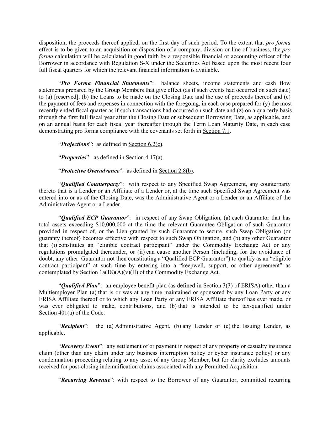 disposition, the proceeds thereof applied, on the first day of such period. To the extent that pro forma effect is to be given to an acquisition or disposition of a company, division or line of business, the pro forma calculation will be calculated in good faith by a responsible financial or accounting officer of the Borrower in accordance with Regulation S-X under the Securities Act based upon the most recent four full fiscal quarters for which the relevant financial information is available. “Pro Forma Financial Statements”: balance sheets, income statements and cash flow statements prepared by the Group Members that give effect (as if such events had occurred on such date) to (a) [reserved], (b) the Loans to be made on the Closing Date and the use of proceeds thereof and (c) the payment of fees and expenses in connection with the foregoing, in each case prepared for (y) the most recently ended fiscal quarter as if such transactions had occurred on such date and (z) on a quarterly basis through the first full fiscal year after the Closing Date or subsequent Borrowing Date, as applicable, and on an annual basis for each fiscal year thereafter through the Term Loan Maturity Date, in each case demonstrating pro forma compliance with the covenants set forth in Section 7.1. “Projections”: as defined in Section 6.2(c). “Properties”: as defined in Section 4.17(a). “Protective Overadvance”: as defined in Section 2.8(b). “Qualified Counterparty”: with respect to any Specified Swap Agreement, any counterparty thereto that is a Lender or an Affiliate of a Lender or, at the time such Specified Swap Agreement was entered into or as of the Closing Date, was the Administrative Agent or a Lender or an Affiliate of the Administrative Agent or a Lender. “Qualified ECP Guarantor”: in respect of any Swap Obligation, (a) each Guarantor that has total assets exceeding $10,000,000 at the time the relevant Guarantee Obligation of such Guarantor provided in respect of, or the Lien granted by such Guarantor to secure, such Swap Obligation (or guaranty thereof) becomes effective with respect to such Swap Obligation, and (b) any other Guarantor that (i) constitutes an “eligible contract participant” under the Commodity Exchange Act or any regulations promulgated thereunder, or (ii) can cause another Person (including, for the avoidance of doubt, any other Guarantor not then constituting a “Qualified ECP Guarantor”) to qualify as an “eligible contract participant” at such time by entering into a “keepwell, support, or other agreement” as contemplated by Section 1a(18)(A)(v)(II) of the Commodity Exchange Act. “Qualified Plan”: an employee benefit plan (as defined in Section 3(3) of ERISA) other than a Multiemployer Plan (a) that is or was at any time maintained or sponsored by any Loan Party or any ERISA Affiliate thereof or to which any Loan Party or any ERISA Affiliate thereof has ever made, or was ever obligated to make, contributions, and (b) that is intended to be tax-qualified under Section 401(a) of the Code. “Recipient”: the (a) Administrative Agent, (b) any Lender or (c) the Issuing Lender, as applicable. “Recovery Event”: any settlement of or payment in respect of any property or casualty insurance claim (other than any claim under any business interruption policy or cyber insurance policy) or any condemnation proceeding relating to any asset of any Group Member, but for clarity excludes amounts received for post-closing indemnification claims associated with any Permitted Acquisition. “Recurring Revenue”: with respect to the Borrower of any Guarantor, committed recurring