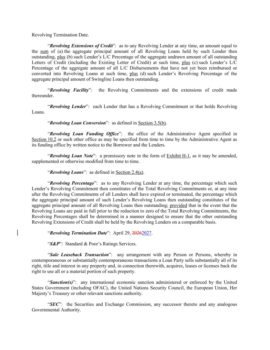 Revolving Termination Date. “Revolving Extensions of Credit”: as to any Revolving Lender at any time, an amount equal to the sum of (a) the aggregate principal amount of all Revolving Loans held by such Lender then outstanding, plus (b) such Lender’s L/C Percentage of the aggregate undrawn amount of all outstanding Letters of Credit (including the Existing Letter of Credit) at such time, plus (c) such Lender’s L/C Percentage of the aggregate amount of all L/C Disbursements that have not yet been reimbursed or converted into Revolving Loans at such time, plus (d) such Lender’s Revolving Percentage of the aggregate principal amount of Swingline Loans then outstanding. “Revolving Facility”: the Revolving Commitments and the extensions of credit made thereunder. “Revolving Lender”: each Lender that has a Revolving Commitment or that holds Revolving Loans. “Revolving Loan Conversion”: as defined in Section 3.5(b). “Revolving Loan Funding Office”: the office of the Administrative Agent specified in Section 10.2 or such other office as may be specified from time to time by the Administrative Agent as its funding office by written notice to the Borrower and the Lenders. “Revolving Loan Note”: a promissory note in the form of Exhibit H-1, as it may be amended, supplemented or otherwise modified from time to time. “Revolving Loans”: as defined in Section 2.4(a). “Revolving Percentage”: as to any Revolving Lender at any time, the percentage which such Lender’s Revolving Commitment then constitutes of the Total Revolving Commitments or, at any time after the Revolving Commitments of all Lenders shall have expired or terminated, the percentage which the aggregate principal amount of such Lender’s Revolving Loans then outstanding constitutes of the aggregate principal amount of all Revolving Loans then outstanding; provided that in the event that the Revolving Loans are paid in full prior to the reduction to zero of the Total Revolving Commitments, the Revolving Percentages shall be determined in a manner designed to ensure that the other outstanding Revolving Extensions of Credit shall be held by the Revolving Lenders on a comparable basis. “Revolving Termination Date”: April 29, 20262027. “S&P”: Standard & Poor’s Ratings Services. “Sale Leaseback Transaction”: any arrangement with any Person or Persons, whereby in contemporaneous or substantially contemporaneous transactions a Loan Party sells substantially all of its right, title and interest in any property and, in connection therewith, acquires, leases or licenses back the right to use all or a material portion of such property. “Sanction(s)”: any international economic sanction administered or enforced by the United States Government (including OFAC), the United Nations Security Council, the European Union, Her Majesty’s Treasury or other relevant sanctions authority. “SEC”: the Securities and Exchange Commission, any successor thereto and any analogous Governmental Authority.