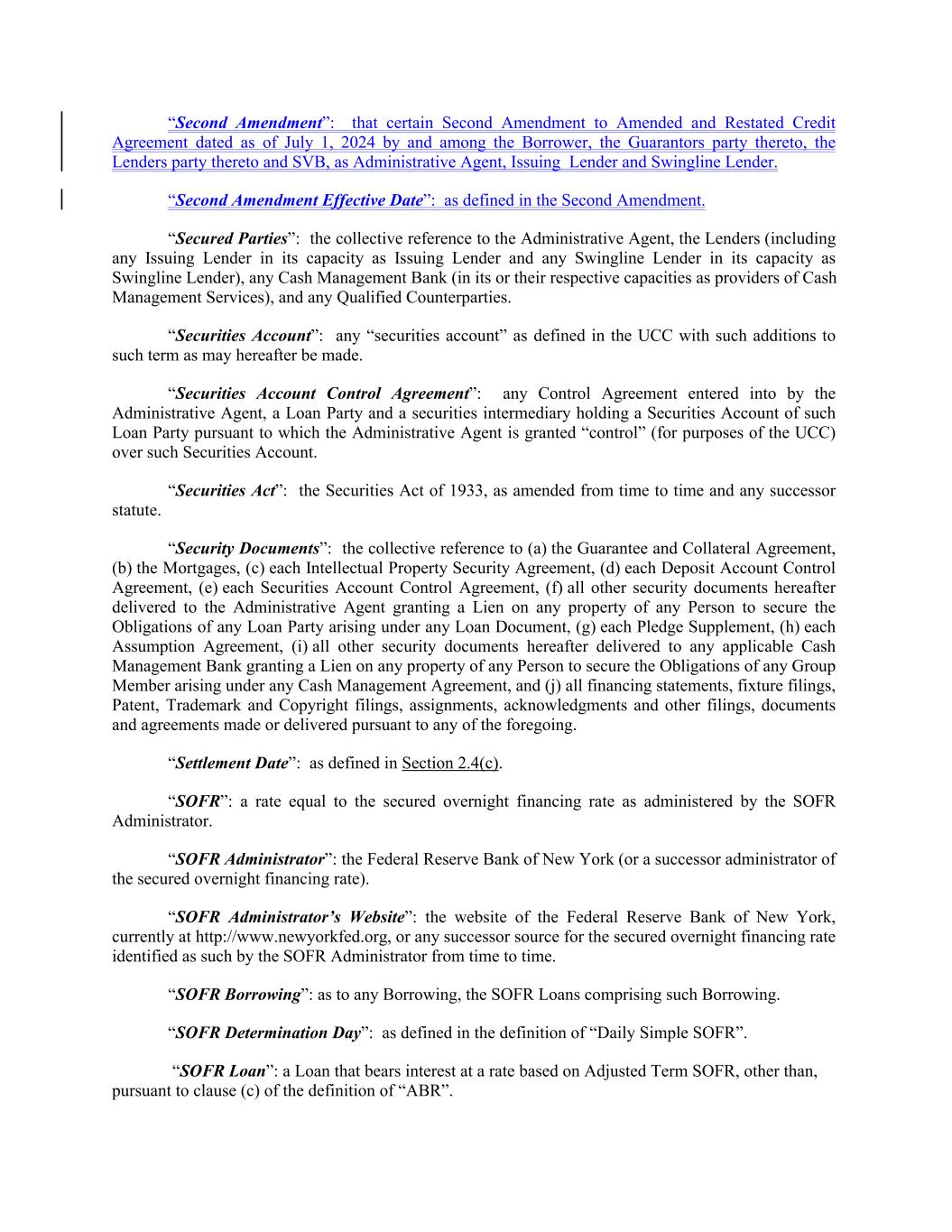 “Second Amendment”: that certain Second Amendment to Amended and Restated Credit Agreement dated as of July 1, 2024 by and among the Borrower, the Guarantors party thereto, the Lenders party thereto and SVB, as Administrative Agent, Issuing Lender and Swingline Lender. “Second Amendment Effective Date”: as defined in the Second Amendment. “Secured Parties”: the collective reference to the Administrative Agent, the Lenders (including any Issuing Lender in its capacity as Issuing Lender and any Swingline Lender in its capacity as Swingline Lender), any Cash Management Bank (in its or their respective capacities as providers of Cash Management Services), and any Qualified Counterparties. “Securities Account”: any “securities account” as defined in the UCC with such additions to such term as may hereafter be made. “Securities Account Control Agreement”: any Control Agreement entered into by the Administrative Agent, a Loan Party and a securities intermediary holding a Securities Account of such Loan Party pursuant to which the Administrative Agent is granted “control” (for purposes of the UCC) over such Securities Account. “Securities Act”: the Securities Act of 1933, as amended from time to time and any successor statute. “Security Documents”: the collective reference to (a) the Guarantee and Collateral Agreement, (b) the Mortgages, (c) each Intellectual Property Security Agreement, (d) each Deposit Account Control Agreement, (e) each Securities Account Control Agreement, (f) all other security documents hereafter delivered to the Administrative Agent granting a Lien on any property of any Person to secure the Obligations of any Loan Party arising under any Loan Document, (g) each Pledge Supplement, (h) each Assumption Agreement, (i) all other security documents hereafter delivered to any applicable Cash Management Bank granting a Lien on any property of any Person to secure the Obligations of any Group Member arising under any Cash Management Agreement, and (j) all financing statements, fixture filings, Patent, Trademark and Copyright filings, assignments, acknowledgments and other filings, documents and agreements made or delivered pursuant to any of the foregoing. “Settlement Date”: as defined in Section 2.4(c). “SOFR”: a rate equal to the secured overnight financing rate as administered by the SOFR Administrator. “SOFR Administrator”: the Federal Reserve Bank of New York (or a successor administrator of the secured overnight financing rate). “SOFR Administrator’s Website”: the website of the Federal Reserve Bank of New York, currently at http://www.newyorkfed.org, or any successor source for the secured overnight financing rate identified as such by the SOFR Administrator from time to time. “SOFR Borrowing”: as to any Borrowing, the SOFR Loans comprising such Borrowing. “SOFR Determination Day”: as defined in the definition of “Daily Simple SOFR”. “SOFR Loan”: a Loan that bears interest at a rate based on Adjusted Term SOFR, other than, pursuant to clause (c) of the definition of “ABR”.