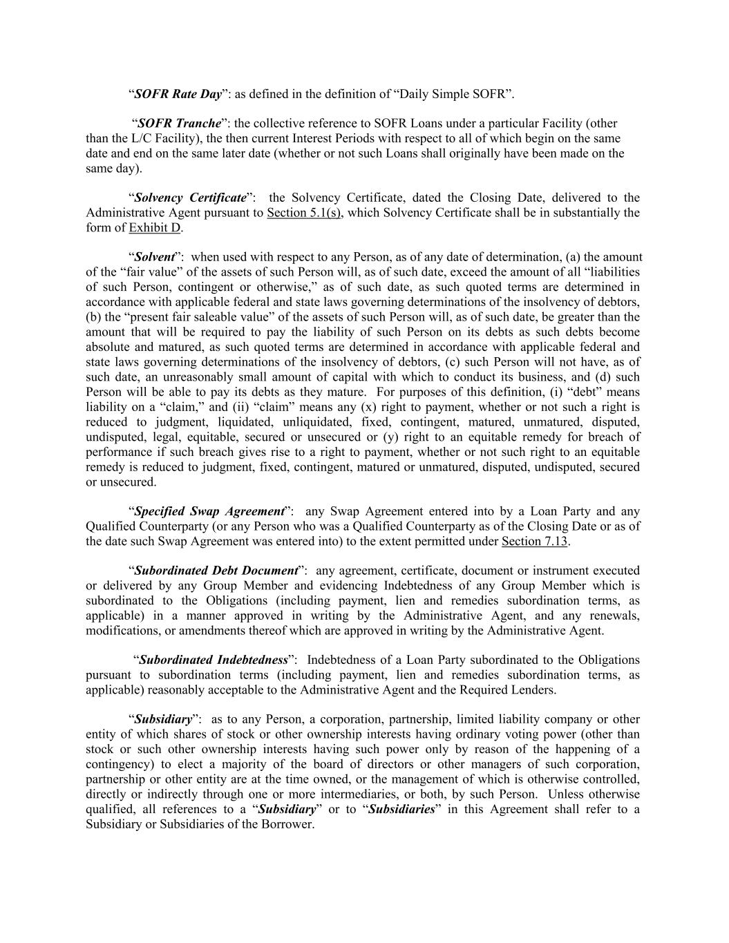 “SOFR Rate Day”: as defined in the definition of “Daily Simple SOFR”. “SOFR Tranche”: the collective reference to SOFR Loans under a particular Facility (other than the L/C Facility), the then current Interest Periods with respect to all of which begin on the same date and end on the same later date (whether or not such Loans shall originally have been made on the same day). “Solvency Certificate”: the Solvency Certificate, dated the Closing Date, delivered to the Administrative Agent pursuant to Section 5.1(s), which Solvency Certificate shall be in substantially the form of Exhibit D. “Solvent”: when used with respect to any Person, as of any date of determination, (a) the amount of the “fair value” of the assets of such Person will, as of such date, exceed the amount of all “liabilities of such Person, contingent or otherwise,” as of such date, as such quoted terms are determined in accordance with applicable federal and state laws governing determinations of the insolvency of debtors, (b) the “present fair saleable value” of the assets of such Person will, as of such date, be greater than the amount that will be required to pay the liability of such Person on its debts as such debts become absolute and matured, as such quoted terms are determined in accordance with applicable federal and state laws governing determinations of the insolvency of debtors, (c) such Person will not have, as of such date, an unreasonably small amount of capital with which to conduct its business, and (d) such Person will be able to pay its debts as they mature. For purposes of this definition, (i) “debt” means liability on a “claim,” and (ii) “claim” means any (x) right to payment, whether or not such a right is reduced to judgment, liquidated, unliquidated, fixed, contingent, matured, unmatured, disputed, undisputed, legal, equitable, secured or unsecured or (y) right to an equitable remedy for breach of performance if such breach gives rise to a right to payment, whether or not such right to an equitable remedy is reduced to judgment, fixed, contingent, matured or unmatured, disputed, undisputed, secured or unsecured. “Specified Swap Agreement”: any Swap Agreement entered into by a Loan Party and any Qualified Counterparty (or any Person who was a Qualified Counterparty as of the Closing Date or as of the date such Swap Agreement was entered into) to the extent permitted under Section 7.13. “Subordinated Debt Document”: any agreement, certificate, document or instrument executed or delivered by any Group Member and evidencing Indebtedness of any Group Member which is subordinated to the Obligations (including payment, lien and remedies subordination terms, as applicable) in a manner approved in writing by the Administrative Agent, and any renewals, modifications, or amendments thereof which are approved in writing by the Administrative Agent. “Subordinated Indebtedness”: Indebtedness of a Loan Party subordinated to the Obligations pursuant to subordination terms (including payment, lien and remedies subordination terms, as applicable) reasonably acceptable to the Administrative Agent and the Required Lenders. “Subsidiary”: as to any Person, a corporation, partnership, limited liability company or other entity of which shares of stock or other ownership interests having ordinary voting power (other than stock or such other ownership interests having such power only by reason of the happening of a contingency) to elect a majority of the board of directors or other managers of such corporation, partnership or other entity are at the time owned, or the management of which is otherwise controlled, directly or indirectly through one or more intermediaries, or both, by such Person. Unless otherwise qualified, all references to a “Subsidiary” or to “Subsidiaries” in this Agreement shall refer to a Subsidiary or Subsidiaries of the Borrower.