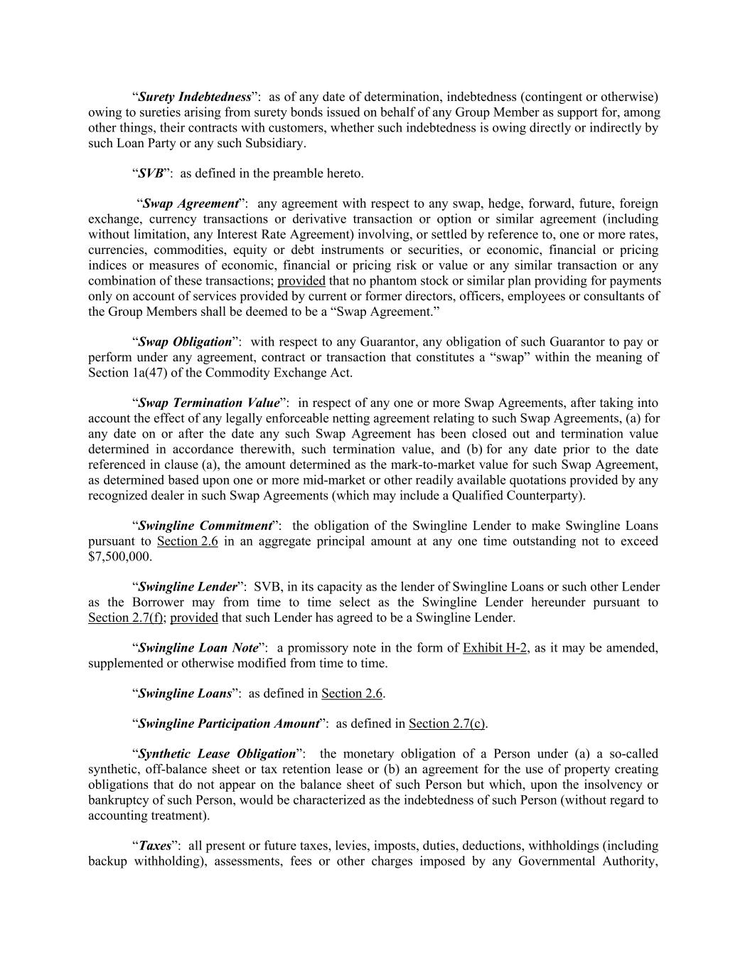 “Surety Indebtedness”: as of any date of determination, indebtedness (contingent or otherwise) owing to sureties arising from surety bonds issued on behalf of any Group Member as support for, among other things, their contracts with customers, whether such indebtedness is owing directly or indirectly by such Loan Party or any such Subsidiary. “SVB”: as defined in the preamble hereto. “Swap Agreement”: any agreement with respect to any swap, hedge, forward, future, foreign exchange, currency transactions or derivative transaction or option or similar agreement (including without limitation, any Interest Rate Agreement) involving, or settled by reference to, one or more rates, currencies, commodities, equity or debt instruments or securities, or economic, financial or pricing indices or measures of economic, financial or pricing risk or value or any similar transaction or any combination of these transactions; provided that no phantom stock or similar plan providing for payments only on account of services provided by current or former directors, officers, employees or consultants of the Group Members shall be deemed to be a “Swap Agreement.” “Swap Obligation”: with respect to any Guarantor, any obligation of such Guarantor to pay or perform under any agreement, contract or transaction that constitutes a “swap” within the meaning of Section 1a(47) of the Commodity Exchange Act. “Swap Termination Value”: in respect of any one or more Swap Agreements, after taking into account the effect of any legally enforceable netting agreement relating to such Swap Agreements, (a) for any date on or after the date any such Swap Agreement has been closed out and termination value determined in accordance therewith, such termination value, and (b) for any date prior to the date referenced in clause (a), the amount determined as the mark-to-market value for such Swap Agreement, as determined based upon one or more mid-market or other readily available quotations provided by any recognized dealer in such Swap Agreements (which may include a Qualified Counterparty). “Swingline Commitment”: the obligation of the Swingline Lender to make Swingline Loans pursuant to Section 2.6 in an aggregate principal amount at any one time outstanding not to exceed $7,500,000. “Swingline Lender”: SVB, in its capacity as the lender of Swingline Loans or such other Lender as the Borrower may from time to time select as the Swingline Lender hereunder pursuant to Section 2.7(f); provided that such Lender has agreed to be a Swingline Lender. “Swingline Loan Note”: a promissory note in the form of Exhibit H-2, as it may be amended, supplemented or otherwise modified from time to time. “Swingline Loans”: as defined in Section 2.6. “Swingline Participation Amount”: as defined in Section 2.7(c). “Synthetic Lease Obligation”: the monetary obligation of a Person under (a) a so-called synthetic, off-balance sheet or tax retention lease or (b) an agreement for the use of property creating obligations that do not appear on the balance sheet of such Person but which, upon the insolvency or bankruptcy of such Person, would be characterized as the indebtedness of such Person (without regard to accounting treatment). “Taxes”: all present or future taxes, levies, imposts, duties, deductions, withholdings (including backup withholding), assessments, fees or other charges imposed by any Governmental Authority,