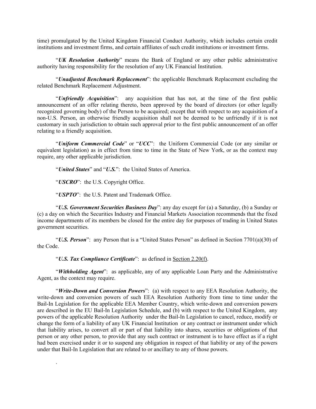time) promulgated by the United Kingdom Financial Conduct Authority, which includes certain credit institutions and investment firms, and certain affiliates of such credit institutions or investment firms. “UK Resolution Authority” means the Bank of England or any other public administrative authority having responsibility for the resolution of any UK Financial Institution. “Unadjusted Benchmark Replacement”: the applicable Benchmark Replacement excluding the related Benchmark Replacement Adjustment. “Unfriendly Acquisition”: any acquisition that has not, at the time of the first public announcement of an offer relating thereto, been approved by the board of directors (or other legally recognized governing body) of the Person to be acquired; except that with respect to any acquisition of a non-U.S. Person, an otherwise friendly acquisition shall not be deemed to be unfriendly if it is not customary in such jurisdiction to obtain such approval prior to the first public announcement of an offer relating to a friendly acquisition. “Uniform Commercial Code” or “UCC”: the Uniform Commercial Code (or any similar or equivalent legislation) as in effect from time to time in the State of New York, or as the context may require, any other applicable jurisdiction. “United States” and “U.S.”: the United States of America. “USCRO”: the U.S. Copyright Office. “USPTO”: the U.S. Patent and Trademark Office. “U.S. Government Securities Business Day”: any day except for (a) a Saturday, (b) a Sunday or (c) a day on which the Securities Industry and Financial Markets Association recommends that the fixed income departments of its members be closed for the entire day for purposes of trading in United States government securities. “U.S. Person”: any Person that is a “United States Person” as defined in Section 7701(a)(30) of the Code. “U.S. Tax Compliance Certificate”: as defined in Section 2.20(f). “Withholding Agent”: as applicable, any of any applicable Loan Party and the Administrative Agent, as the context may require. “Write-Down and Conversion Powers”: (a) with respect to any EEA Resolution Authority, the write-down and conversion powers of such EEA Resolution Authority from time to time under the Bail-In Legislation for the applicable EEA Member Country, which write-down and conversion powers are described in the EU Bail-In Legislation Schedule, and (b) with respect to the United Kingdom, any powers of the applicable Resolution Authority under the Bail-In Legislation to cancel, reduce, modify or change the form of a liability of any UK Financial Institution or any contract or instrument under which that liability arises, to convert all or part of that liability into shares, securities or obligations of that person or any other person, to provide that any such contract or instrument is to have effect as if a right had been exercised under it or to suspend any obligation in respect of that liability or any of the powers under that Bail-In Legislation that are related to or ancillary to any of those powers. .