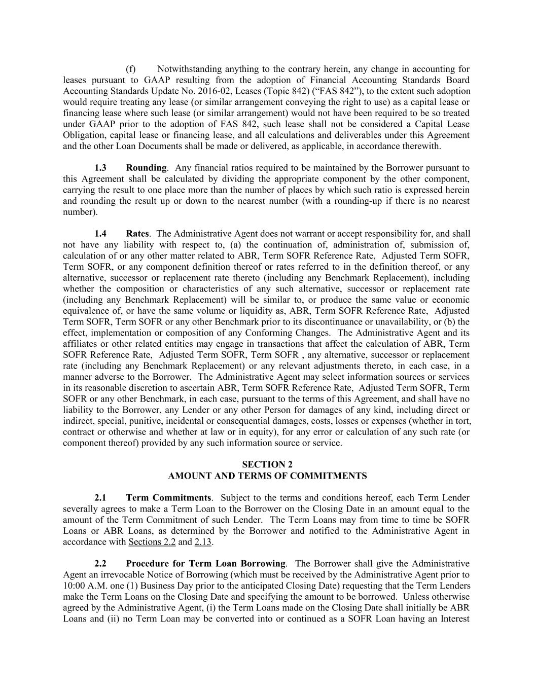 (f) Notwithstanding anything to the contrary herein, any change in accounting for leases pursuant to GAAP resulting from the adoption of Financial Accounting Standards Board Accounting Standards Update No. 2016-02, Leases (Topic 842) (“FAS 842”), to the extent such adoption would require treating any lease (or similar arrangement conveying the right to use) as a capital lease or financing lease where such lease (or similar arrangement) would not have been required to be so treated under GAAP prior to the adoption of FAS 842, such lease shall not be considered a Capital Lease Obligation, capital lease or financing lease, and all calculations and deliverables under this Agreement and the other Loan Documents shall be made or delivered, as applicable, in accordance therewith. 1.3 Rounding. Any financial ratios required to be maintained by the Borrower pursuant to this Agreement shall be calculated by dividing the appropriate component by the other component, carrying the result to one place more than the number of places by which such ratio is expressed herein and rounding the result up or down to the nearest number (with a rounding-up if there is no nearest number). 1.4 Rates. The Administrative Agent does not warrant or accept responsibility for, and shall not have any liability with respect to, (a) the continuation of, administration of, submission of, calculation of or any other matter related to ABR, Term SOFR Reference Rate, Adjusted Term SOFR, Term SOFR, or any component definition thereof or rates referred to in the definition thereof, or any alternative, successor or replacement rate thereto (including any Benchmark Replacement), including whether the composition or characteristics of any such alternative, successor or replacement rate (including any Benchmark Replacement) will be similar to, or produce the same value or economic equivalence of, or have the same volume or liquidity as, ABR, Term SOFR Reference Rate, Adjusted Term SOFR, Term SOFR or any other Benchmark prior to its discontinuance or unavailability, or (b) the effect, implementation or composition of any Conforming Changes. The Administrative Agent and its affiliates or other related entities may engage in transactions that affect the calculation of ABR, Term SOFR Reference Rate, Adjusted Term SOFR, Term SOFR , any alternative, successor or replacement rate (including any Benchmark Replacement) or any relevant adjustments thereto, in each case, in a manner adverse to the Borrower. The Administrative Agent may select information sources or services in its reasonable discretion to ascertain ABR, Term SOFR Reference Rate, Adjusted Term SOFR, Term SOFR or any other Benchmark, in each case, pursuant to the terms of this Agreement, and shall have no liability to the Borrower, any Lender or any other Person for damages of any kind, including direct or indirect, special, punitive, incidental or consequential damages, costs, losses or expenses (whether in tort, contract or otherwise and whether at law or in equity), for any error or calculation of any such rate (or component thereof) provided by any such information source or service. SECTION 2 AMOUNT AND TERMS OF COMMITMENTS 2.1 Term Commitments. Subject to the terms and conditions hereof, each Term Lender severally agrees to make a Term Loan to the Borrower on the Closing Date in an amount equal to the amount of the Term Commitment of such Lender. The Term Loans may from time to time be SOFR Loans or ABR Loans, as determined by the Borrower and notified to the Administrative Agent in accordance with Sections 2.2 and 2.13. 2.2 Procedure for Term Loan Borrowing. The Borrower shall give the Administrative Agent an irrevocable Notice of Borrowing (which must be received by the Administrative Agent prior to 10:00 A.M. one (1) Business Day prior to the anticipated Closing Date) requesting that the Term Lenders make the Term Loans on the Closing Date and specifying the amount to be borrowed. Unless otherwise agreed by the Administrative Agent, (i) the Term Loans made on the Closing Date shall initially be ABR Loans and (ii) no Term Loan may be converted into or continued as a SOFR Loan having an Interest