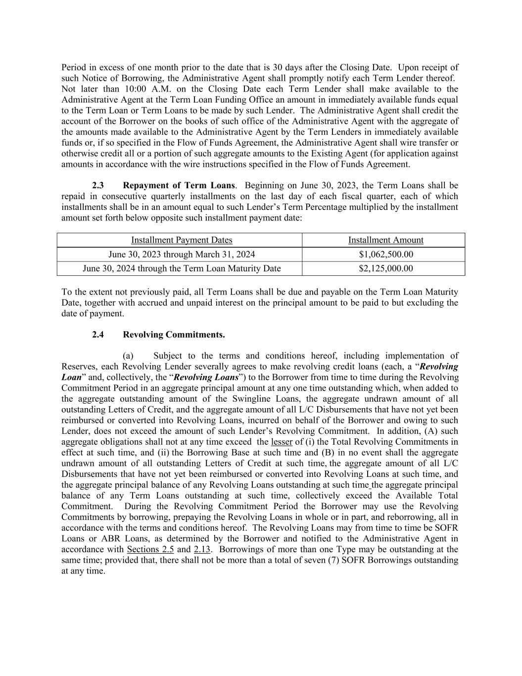 June 30, 2023 through March 31, 2024 $1,062,500.00 Installment Payment Dates June 30, 2024 through the Term Loan Maturity Date Installment Amount $2,125,000.00 Period in excess of one month prior to the date that is 30 days after the Closing Date. Upon receipt of such Notice of Borrowing, the Administrative Agent shall promptly notify each Term Lender thereof. Not later than 10:00 A.M. on the Closing Date each Term Lender shall make available to the Administrative Agent at the Term Loan Funding Office an amount in immediately available funds equal to the Term Loan or Term Loans to be made by such Lender. The Administrative Agent shall credit the account of the Borrower on the books of such office of the Administrative Agent with the aggregate of the amounts made available to the Administrative Agent by the Term Lenders in immediately available funds or, if so specified in the Flow of Funds Agreement, the Administrative Agent shall wire transfer or otherwise credit all or a portion of such aggregate amounts to the Existing Agent (for application against amounts in accordance with the wire instructions specified in the Flow of Funds Agreement. 2.3 Repayment of Term Loans. Beginning on June 30, 2023, the Term Loans shall be repaid in consecutive quarterly installments on the last day of each fiscal quarter, each of which installments shall be in an amount equal to such Lender’s Term Percentage multiplied by the installment amount set forth below opposite such installment payment date: To the extent not previously paid, all Term Loans shall be due and payable on the Term Loan Maturity Date, together with accrued and unpaid interest on the principal amount to be paid to but excluding the date of payment. 2.4 Revolving Commitments. (a) Subject to the terms and conditions hereof, including implementation of Reserves, each Revolving Lender severally agrees to make revolving credit loans (each, a “Revolving Loan” and, collectively, the “Revolving Loans”) to the Borrower from time to time during the Revolving Commitment Period in an aggregate principal amount at any one time outstanding which, when added to the aggregate outstanding amount of the Swingline Loans, the aggregate undrawn amount of all outstanding Letters of Credit, and the aggregate amount of all L/C Disbursements that have not yet been reimbursed or converted into Revolving Loans, incurred on behalf of the Borrower and owing to such Lender, does not exceed the amount of such Lender’s Revolving Commitment. In addition, (A) such aggregate obligations shall not at any time exceed the lesser of (i) the Total Revolving Commitments in effect at such time, and (ii) the Borrowing Base at such time and (B) in no event shall the aggregate undrawn amount of all outstanding Letters of Credit at such time, the aggregate amount of all L/C Disbursements that have not yet been reimbursed or converted into Revolving Loans at such time, and the aggregate principal balance of any Revolving Loans outstanding at such time the aggregate principal balance of any Term Loans outstanding at such time, collectively exceed the Available Total Commitment. During the Revolving Commitment Period the Borrower may use the Revolving Commitments by borrowing, prepaying the Revolving Loans in whole or in part, and reborrowing, all in accordance with the terms and conditions hereof. The Revolving Loans may from time to time be SOFR Loans or ABR Loans, as determined by the Borrower and notified to the Administrative Agent in accordance with Sections 2.5 and 2.13. Borrowings of more than one Type may be outstanding at the same time; provided that, there shall not be more than a total of seven (7) SOFR Borrowings outstanding at any time.
