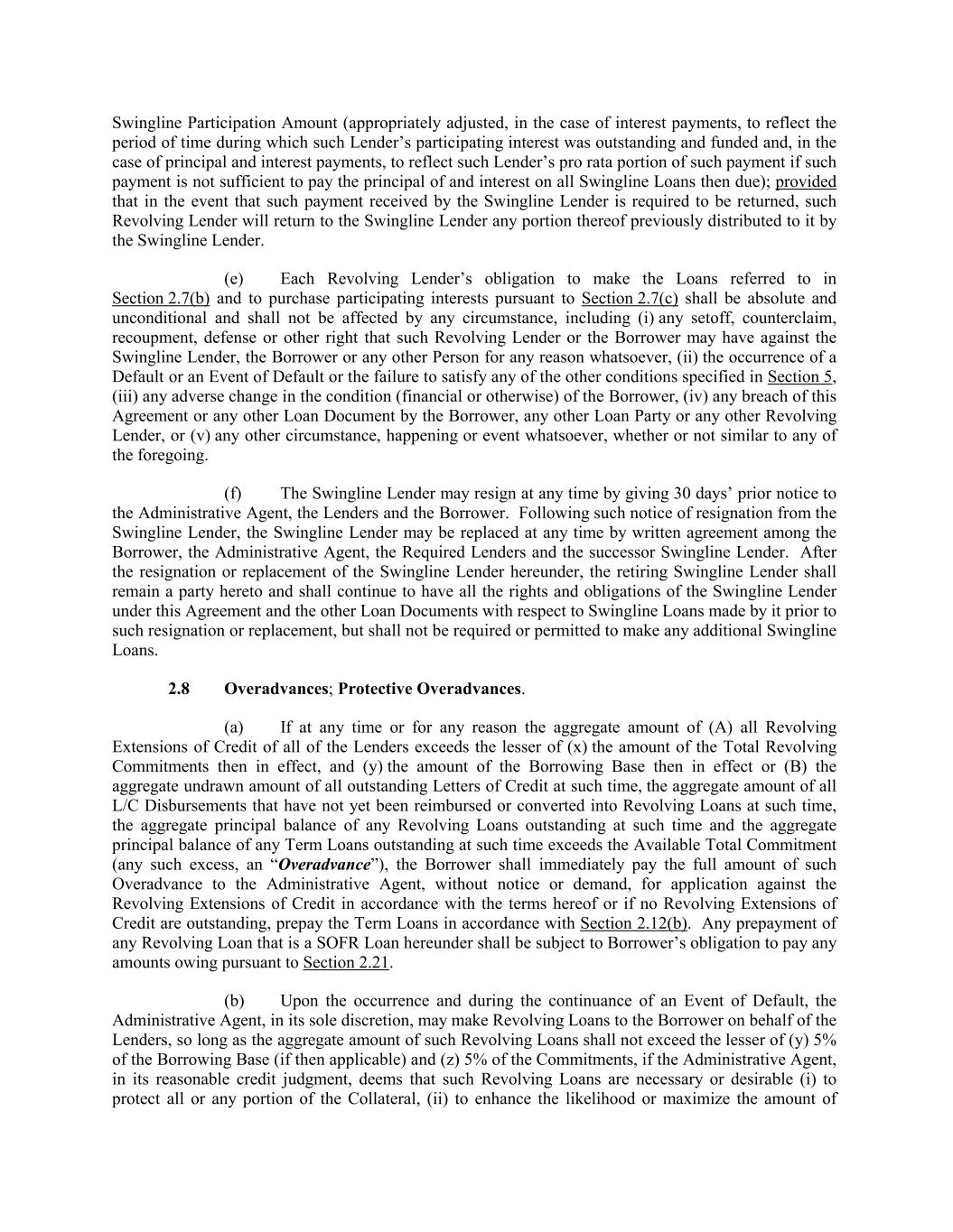 Swingline Participation Amount (appropriately adjusted, in the case of interest payments, to reflect the period of time during which such Lender’s participating interest was outstanding and funded and, in the case of principal and interest payments, to reflect such Lender’s pro rata portion of such payment if such payment is not sufficient to pay the principal of and interest on all Swingline Loans then due); provided that in the event that such payment received by the Swingline Lender is required to be returned, such Revolving Lender will return to the Swingline Lender any portion thereof previously distributed to it by the Swingline Lender. (e) Each Revolving Lender’s obligation to make the Loans referred to in Section 2.7(b) and to purchase participating interests pursuant to Section 2.7(c) shall be absolute and unconditional and shall not be affected by any circumstance, including (i) any setoff, counterclaim, recoupment, defense or other right that such Revolving Lender or the Borrower may have against the Swingline Lender, the Borrower or any other Person for any reason whatsoever, (ii) the occurrence of a Default or an Event of Default or the failure to satisfy any of the other conditions specified in Section 5, (iii) any adverse change in the condition (financial or otherwise) of the Borrower, (iv) any breach of this Agreement or any other Loan Document by the Borrower, any other Loan Party or any other Revolving Lender, or (v) any other circumstance, happening or event whatsoever, whether or not similar to any of the foregoing. (f) The Swingline Lender may resign at any time by giving 30 days’ prior notice to the Administrative Agent, the Lenders and the Borrower. Following such notice of resignation from the Swingline Lender, the Swingline Lender may be replaced at any time by written agreement among the Borrower, the Administrative Agent, the Required Lenders and the successor Swingline Lender. After the resignation or replacement of the Swingline Lender hereunder, the retiring Swingline Lender shall remain a party hereto and shall continue to have all the rights and obligations of the Swingline Lender under this Agreement and the other Loan Documents with respect to Swingline Loans made by it prior to such resignation or replacement, but shall not be required or permitted to make any additional Swingline Loans. 2.8 Overadvances; Protective Overadvances. (a) If at any time or for any reason the aggregate amount of (A) all Revolving Extensions of Credit of all of the Lenders exceeds the lesser of (x) the amount of the Total Revolving Commitments then in effect, and (y) the amount of the Borrowing Base then in effect or (B) the aggregate undrawn amount of all outstanding Letters of Credit at such time, the aggregate amount of all L/C Disbursements that have not yet been reimbursed or converted into Revolving Loans at such time, the aggregate principal balance of any Revolving Loans outstanding at such time and the aggregate principal balance of any Term Loans outstanding at such time exceeds the Available Total Commitment (any such excess, an “Overadvance”), the Borrower shall immediately pay the full amount of such Overadvance to the Administrative Agent, without notice or demand, for application against the Revolving Extensions of Credit in accordance with the terms hereof or if no Revolving Extensions of Credit are outstanding, prepay the Term Loans in accordance with Section 2.12(b). Any prepayment of any Revolving Loan that is a SOFR Loan hereunder shall be subject to Borrower’s obligation to pay any amounts owing pursuant to Section 2.21. (b) Upon the occurrence and during the continuance of an Event of Default, the Administrative Agent, in its sole discretion, may make Revolving Loans to the Borrower on behalf of the Lenders, so long as the aggregate amount of such Revolving Loans shall not exceed the lesser of (y) 5% of the Borrowing Base (if then applicable) and (z) 5% of the Commitments, if the Administrative Agent, in its reasonable credit judgment, deems that such Revolving Loans are necessary or desirable (i) to protect all or any portion of the Collateral, (ii) to enhance the likelihood or maximize the amount of