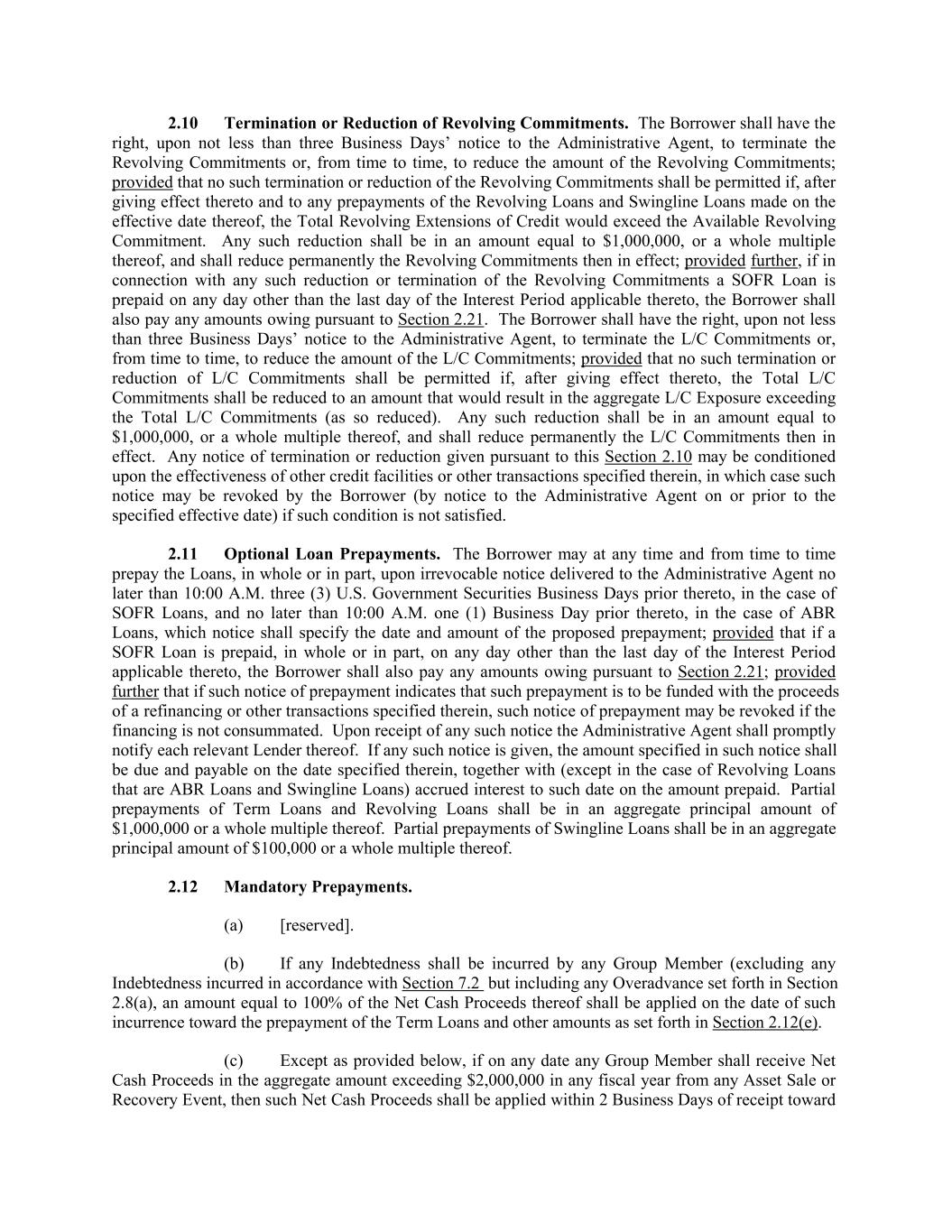 2.10 Termination or Reduction of Revolving Commitments. The Borrower shall have the right, upon not less than three Business Days’ notice to the Administrative Agent, to terminate the Revolving Commitments or, from time to time, to reduce the amount of the Revolving Commitments; provided that no such termination or reduction of the Revolving Commitments shall be permitted if, after giving effect thereto and to any prepayments of the Revolving Loans and Swingline Loans made on the effective date thereof, the Total Revolving Extensions of Credit would exceed the Available Revolving Commitment. Any such reduction shall be in an amount equal to $1,000,000, or a whole multiple thereof, and shall reduce permanently the Revolving Commitments then in effect; provided further, if in connection with any such reduction or termination of the Revolving Commitments a SOFR Loan is prepaid on any day other than the last day of the Interest Period applicable thereto, the Borrower shall also pay any amounts owing pursuant to Section 2.21. The Borrower shall have the right, upon not less than three Business Days’ notice to the Administrative Agent, to terminate the L/C Commitments or, from time to time, to reduce the amount of the L/C Commitments; provided that no such termination or reduction of L/C Commitments shall be permitted if, after giving effect thereto, the Total L/C Commitments shall be reduced to an amount that would result in the aggregate L/C Exposure exceeding the Total L/C Commitments (as so reduced). Any such reduction shall be in an amount equal to $1,000,000, or a whole multiple thereof, and shall reduce permanently the L/C Commitments then in effect. Any notice of termination or reduction given pursuant to this Section 2.10 may be conditioned upon the effectiveness of other credit facilities or other transactions specified therein, in which case such notice may be revoked by the Borrower (by notice to the Administrative Agent on or prior to the specified effective date) if such condition is not satisfied. 2.11 Optional Loan Prepayments. The Borrower may at any time and from time to time prepay the Loans, in whole or in part, upon irrevocable notice delivered to the Administrative Agent no later than 10:00 A.M. three (3) U.S. Government Securities Business Days prior thereto, in the case of SOFR Loans, and no later than 10:00 A.M. one (1) Business Day prior thereto, in the case of ABR Loans, which notice shall specify the date and amount of the proposed prepayment; provided that if a SOFR Loan is prepaid, in whole or in part, on any day other than the last day of the Interest Period applicable thereto, the Borrower shall also pay any amounts owing pursuant to Section 2.21; provided further that if such notice of prepayment indicates that such prepayment is to be funded with the proceeds of a refinancing or other transactions specified therein, such notice of prepayment may be revoked if the financing is not consummated. Upon receipt of any such notice the Administrative Agent shall promptly notify each relevant Lender thereof. If any such notice is given, the amount specified in such notice shall be due and payable on the date specified therein, together with (except in the case of Revolving Loans that are ABR Loans and Swingline Loans) accrued interest to such date on the amount prepaid. Partial prepayments of Term Loans and Revolving Loans shall be in an aggregate principal amount of $1,000,000 or a whole multiple thereof. Partial prepayments of Swingline Loans shall be in an aggregate principal amount of $100,000 or a whole multiple thereof. 2.12 Mandatory Prepayments. (a) [reserved]. (b) If any Indebtedness shall be incurred by any Group Member (excluding any Indebtedness incurred in accordance with Section 7.2 but including any Overadvance set forth in Section 2.8(a), an amount equal to 100% of the Net Cash Proceeds thereof shall be applied on the date of such incurrence toward the prepayment of the Term Loans and other amounts as set forth in Section 2.12(e). (c) Except as provided below, if on any date any Group Member shall receive Net Cash Proceeds in the aggregate amount exceeding $2,000,000 in any fiscal year from any Asset Sale or Recovery Event, then such Net Cash Proceeds shall be applied within 2 Business Days of receipt toward