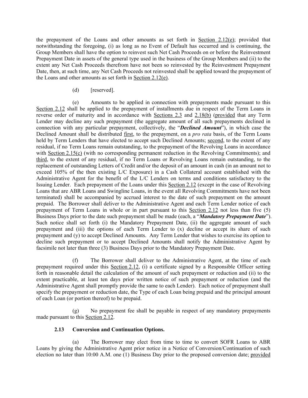 the prepayment of the Loans and other amounts as set forth in Section 2.12(e); provided that notwithstanding the foregoing, (i) as long as no Event of Default has occurred and is continuing, the Group Members shall have the option to reinvest such Net Cash Proceeds on or before the Reinvestment Prepayment Date in assets of the general type used in the business of the Group Members and (ii) to the extent any Net Cash Proceeds therefrom have not been so reinvested by the Reinvestment Prepayment Date, then, at such time, any Net Cash Proceeds not reinvested shall be applied toward the prepayment of the Loans and other amounts as set forth in Section 2.12(e). (d) [reserved]. (e) Amounts to be applied in connection with prepayments made pursuant to this Section 2.12 shall be applied to the prepayment of installments due in respect of the Term Loans in reverse order of maturity and in accordance with Sections 2.3 and 2.18(b) (provided that any Term Lender may decline any such prepayment (the aggregate amount of all such prepayments declined in connection with any particular prepayment, collectively, the “Declined Amount”), in which case the Declined Amount shall be distributed first, to the prepayment, on a pro rata basis, of the Term Loans held by Term Lenders that have elected to accept such Declined Amounts; second, to the extent of any residual, if no Term Loans remain outstanding, to the prepayment of the Revolving Loans in accordance with Section 2.15(c) (with no corresponding permanent reduction in the Revolving Commitments); and third, to the extent of any residual, if no Term Loans or Revolving Loans remain outstanding, to the replacement of outstanding Letters of Credit and/or the deposit of an amount in cash (in an amount not to exceed 105% of the then existing L/C Exposure) in a Cash Collateral account established with the Administrative Agent for the benefit of the L/C Lenders on terms and conditions satisfactory to the Issuing Lender. Each prepayment of the Loans under this Section 2.12 (except in the case of Revolving Loans that are ABR Loans and Swingline Loans, in the event all Revolving Commitments have not been terminated) shall be accompanied by accrued interest to the date of such prepayment on the amount prepaid. The Borrower shall deliver to the Administrative Agent and each Term Lender notice of each prepayment of Term Loans in whole or in part pursuant to this Section 2.12 not less than five (5) Business Days prior to the date such prepayment shall be made (each, a “Mandatory Prepayment Date”). Such notice shall set forth (i) the Mandatory Prepayment Date, (ii) the aggregate amount of such prepayment and (iii) the options of each Term Lender to (x) decline or accept its share of such prepayment and (y) to accept Declined Amounts. Any Term Lender that wishes to exercise its option to decline such prepayment or to accept Declined Amounts shall notify the Administrative Agent by facsimile not later than three (3) Business Days prior to the Mandatory Prepayment Date. (f) The Borrower shall deliver to the Administrative Agent, at the time of each prepayment required under this Section 2.12, (i) a certificate signed by a Responsible Officer setting forth in reasonable detail the calculation of the amount of such prepayment or reduction and (ii) to the extent practicable, at least ten days prior written notice of such prepayment or reduction (and the Administrative Agent shall promptly provide the same to each Lender). Each notice of prepayment shall specify the prepayment or reduction date, the Type of each Loan being prepaid and the principal amount of each Loan (or portion thereof) to be prepaid. (g) No prepayment fee shall be payable in respect of any mandatory prepayments made pursuant to this Section 2.12. 2.13 Conversion and Continuation Options. (a) The Borrower may elect from time to time to convert SOFR Loans to ABR Loans by giving the Administrative Agent prior notice in a Notice of Conversion/Continuation of such election no later than 10:00 A.M. one (1) Business Day prior to the proposed conversion date; provided