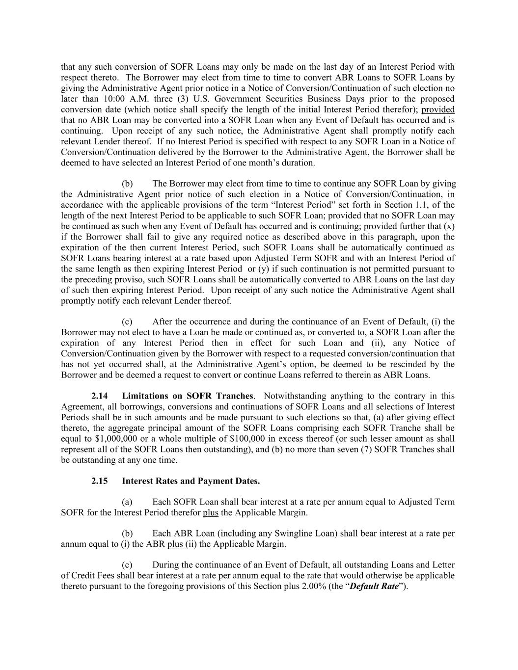 that any such conversion of SOFR Loans may only be made on the last day of an Interest Period with respect thereto. The Borrower may elect from time to time to convert ABR Loans to SOFR Loans by giving the Administrative Agent prior notice in a Notice of Conversion/Continuation of such election no later than 10:00 A.M. three (3) U.S. Government Securities Business Days prior to the proposed conversion date (which notice shall specify the length of the initial Interest Period therefor); provided that no ABR Loan may be converted into a SOFR Loan when any Event of Default has occurred and is continuing. Upon receipt of any such notice, the Administrative Agent shall promptly notify each relevant Lender thereof. If no Interest Period is specified with respect to any SOFR Loan in a Notice of Conversion/Continuation delivered by the Borrower to the Administrative Agent, the Borrower shall be deemed to have selected an Interest Period of one month’s duration. (b) The Borrower may elect from time to time to continue any SOFR Loan by giving the Administrative Agent prior notice of such election in a Notice of Conversion/Continuation, in accordance with the applicable provisions of the term “Interest Period” set forth in Section 1.1, of the length of the next Interest Period to be applicable to such SOFR Loan; provided that no SOFR Loan may be continued as such when any Event of Default has occurred and is continuing; provided further that (x) if the Borrower shall fail to give any required notice as described above in this paragraph, upon the expiration of the then current Interest Period, such SOFR Loans shall be automatically continued as SOFR Loans bearing interest at a rate based upon Adjusted Term SOFR and with an Interest Period of the same length as then expiring Interest Period or (y) if such continuation is not permitted pursuant to the preceding proviso, such SOFR Loans shall be automatically converted to ABR Loans on the last day of such then expiring Interest Period. Upon receipt of any such notice the Administrative Agent shall promptly notify each relevant Lender thereof. (c) After the occurrence and during the continuance of an Event of Default, (i) the Borrower may not elect to have a Loan be made or continued as, or converted to, a SOFR Loan after the expiration of any Interest Period then in effect for such Loan and (ii), any Notice of Conversion/Continuation given by the Borrower with respect to a requested conversion/continuation that has not yet occurred shall, at the Administrative Agent’s option, be deemed to be rescinded by the Borrower and be deemed a request to convert or continue Loans referred to therein as ABR Loans. 2.14 Limitations on SOFR Tranches. Notwithstanding anything to the contrary in this Agreement, all borrowings, conversions and continuations of SOFR Loans and all selections of Interest Periods shall be in such amounts and be made pursuant to such elections so that, (a) after giving effect thereto, the aggregate principal amount of the SOFR Loans comprising each SOFR Tranche shall be equal to $1,000,000 or a whole multiple of $100,000 in excess thereof (or such lesser amount as shall represent all of the SOFR Loans then outstanding), and (b) no more than seven (7) SOFR Tranches shall be outstanding at any one time. 2.15 Interest Rates and Payment Dates. (a) Each SOFR Loan shall bear interest at a rate per annum equal to Adjusted Term SOFR for the Interest Period therefor plus the Applicable Margin. (b) Each ABR Loan (including any Swingline Loan) shall bear interest at a rate per annum equal to (i) the ABR plus (ii) the Applicable Margin. (c) During the continuance of an Event of Default, all outstanding Loans and Letter of Credit Fees shall bear interest at a rate per annum equal to the rate that would otherwise be applicable thereto pursuant to the foregoing provisions of this Section plus 2.00% (the “Default Rate”).