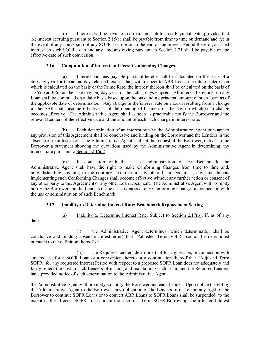 (d) Interest shall be payable in arrears on each Interest Payment Date; provided that (x) interest accruing pursuant to Section 2.15(c) shall be payable from time to time on demand and (y) in the event of any conversion of any SOFR Loan prior to the end of the Interest Period therefor, accrued interest on such SOFR Loan and any amounts owing pursuant to Section 2.21 shall be payable on the effective date of such conversion. 2.16 Computation of Interest and Fees; Conforming Changes. (a) Interest and fees payable pursuant hereto shall be calculated on the basis of a 360-day year for the actual days elapsed, except that, with respect to ABR Loans the rate of interest on which is calculated on the basis of the Prime Rate, the interest thereon shall be calculated on the basis of a 365- (or 366-, as the case may be) day year for the actual days elapsed. All interest hereunder on any Loan shall be computed on a daily basis based upon the outstanding principal amount of such Loan as of the applicable date of determination. Any change in the interest rate on a Loan resulting from a change in the ABR shall become effective as of the opening of business on the day on which such change becomes effective. The Administrative Agent shall as soon as practicable notify the Borrower and the relevant Lenders of the effective date and the amount of each such change in interest rate. (b) Each determination of an interest rate by the Administrative Agent pursuant to any provision of this Agreement shall be conclusive and binding on the Borrower and the Lenders in the absence of manifest error. The Administrative Agent shall, at the request of the Borrower, deliver to the Borrower a statement showing the quotations used by the Administrative Agent in determining any interest rate pursuant to Section 2.16(a). (c) In connection with the use or administration of any Benchmark, the Administrative Agent shall have the right to make Conforming Changes from time to time and, notwithstanding anything to the contrary herein or in any other Loan Document, any amendments implementing such Conforming Changes shall become effective without any further action or consent of any other party to this Agreement or any other Loan Document. The Administrative Agent will promptly notify the Borrower and the Lenders of the effectiveness of any Conforming Changes in connection with the use or administration of such Benchmark. 2.17 Inability to Determine Interest Rate; Benchmark Replacement Setting. (a) Inability to Determine Interest Rate. Subject to Section 2.17(b), if, as of any date: (i) the Administrative Agent determines (which determination shall be conclusive and binding absent manifest error) that “Adjusted Term SOFR” cannot be determined pursuant to the definition thereof, or (ii) the Required Lenders determine that for any reason, in connection with any request for a SOFR Loan or a conversion thereto or a continuation thereof that “Adjusted Term SOFR” for any requested Interest Period with respect to a proposed SOFR Loan does not adequately and fairly reflect the cost to such Lenders of making and maintaining such Loan, and the Required Lenders have provided notice of such determination to the Administrative Agent, the Administrative Agent will promptly so notify the Borrower and each Lender. Upon notice thereof by the Administrative Agent to the Borrower, any obligation of the Lenders to make and any right of the Borrower to continue SOFR Loans or to convert ABR Loans to SOFR Loans shall be suspended (to the extent of the affected SOFR Loans or, in the case of a Term SOFR Borrowing, the affected Interest