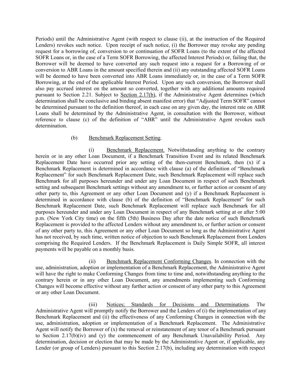 Periods) until the Administrative Agent (with respect to clause (ii), at the instruction of the Required Lenders) revokes such notice. Upon receipt of such notice, (i) the Borrower may revoke any pending request for a borrowing of, conversion to or continuation of SOFR Loans (to the extent of the affected SOFR Loans or, in the case of a Term SOFR Borrowing, the affected Interest Periods) or, failing that, the Borrower will be deemed to have converted any such request into a request for a Borrowing of or conversion to ABR Loans in the amount specified therein and (ii) any outstanding affected SOFR Loans will be deemed to have been converted into ABR Loans immediately or, in the case of a Term SOFR Borrowing, at the end of the applicable Interest Period. Upon any such conversion, the Borrower shall also pay accrued interest on the amount so converted, together with any additional amounts required pursuant to Section 2.21. Subject to Section 2.17(b), if the Administrative Agent determines (which determination shall be conclusive and binding absent manifest error) that “Adjusted Term SOFR” cannot be determined pursuant to the definition thereof, in each case on any given day, the interest rate on ABR Loans shall be determined by the Administrative Agent, in consultation with the Borrower, without reference to clause (c) of the definition of “ABR” until the Administrative Agent revokes such determination. (b) Benchmark Replacement Setting. (i) Benchmark Replacement. Notwithstanding anything to the contrary herein or in any other Loan Document, if a Benchmark Transition Event and its related Benchmark Replacement Date have occurred prior any setting of the then-current Benchmark, then (x) if a Benchmark Replacement is determined in accordance with clause (a) of the definition of “Benchmark Replacement” for such Benchmark Replacement Date, such Benchmark Replacement will replace such Benchmark for all purposes hereunder and under any Loan Document in respect of such Benchmark setting and subsequent Benchmark settings without any amendment to, or further action or consent of any other party to, this Agreement or any other Loan Document and (y) if a Benchmark Replacement is determined in accordance with clause (b) of the definition of “Benchmark Replacement” for such Benchmark Replacement Date, such Benchmark Replacement will replace such Benchmark for all purposes hereunder and under any Loan Document in respect of any Benchmark setting at or after 5:00 p.m. (New York City time) on the fifth (5th) Business Day after the date notice of such Benchmark Replacement is provided to the affected Lenders without any amendment to, or further action or consent of any other party to, this Agreement or any other Loan Document so long as the Administrative Agent has not received, by such time, written notice of objection to such Benchmark Replacement from Lenders comprising the Required Lenders. If the Benchmark Replacement is Daily Simple SOFR, all interest payments will be payable on a monthly basis. (ii) Benchmark Replacement Conforming Changes. In connection with the use, administration, adoption or implementation of a Benchmark Replacement, the Administrative Agent will have the right to make Conforming Changes from time to time and, notwithstanding anything to the contrary herein or in any other Loan Document, any amendments implementing such Conforming Changes will become effective without any further action or consent of any other party to this Agreement or any other Loan Document. (iii) Notices; Standards for Decisions and Determinations. The Administrative Agent will promptly notify the Borrower and the Lenders of (i) the implementation of any Benchmark Replacement and (ii) the effectiveness of any Conforming Changes in connection with the use, administration, adoption or implementation of a Benchmark Replacement. The Administrative Agent will notify the Borrower of (x) the removal or reinstatement of any tenor of a Benchmark pursuant to Section 2.17(b)(iv) and (y) the commencement of any Benchmark Unavailability Period. Any determination, decision or election that may be made by the Administrative Agent or, if applicable, any Lender (or group of Lenders) pursuant to this Section 2.17(b), including any determination with respect