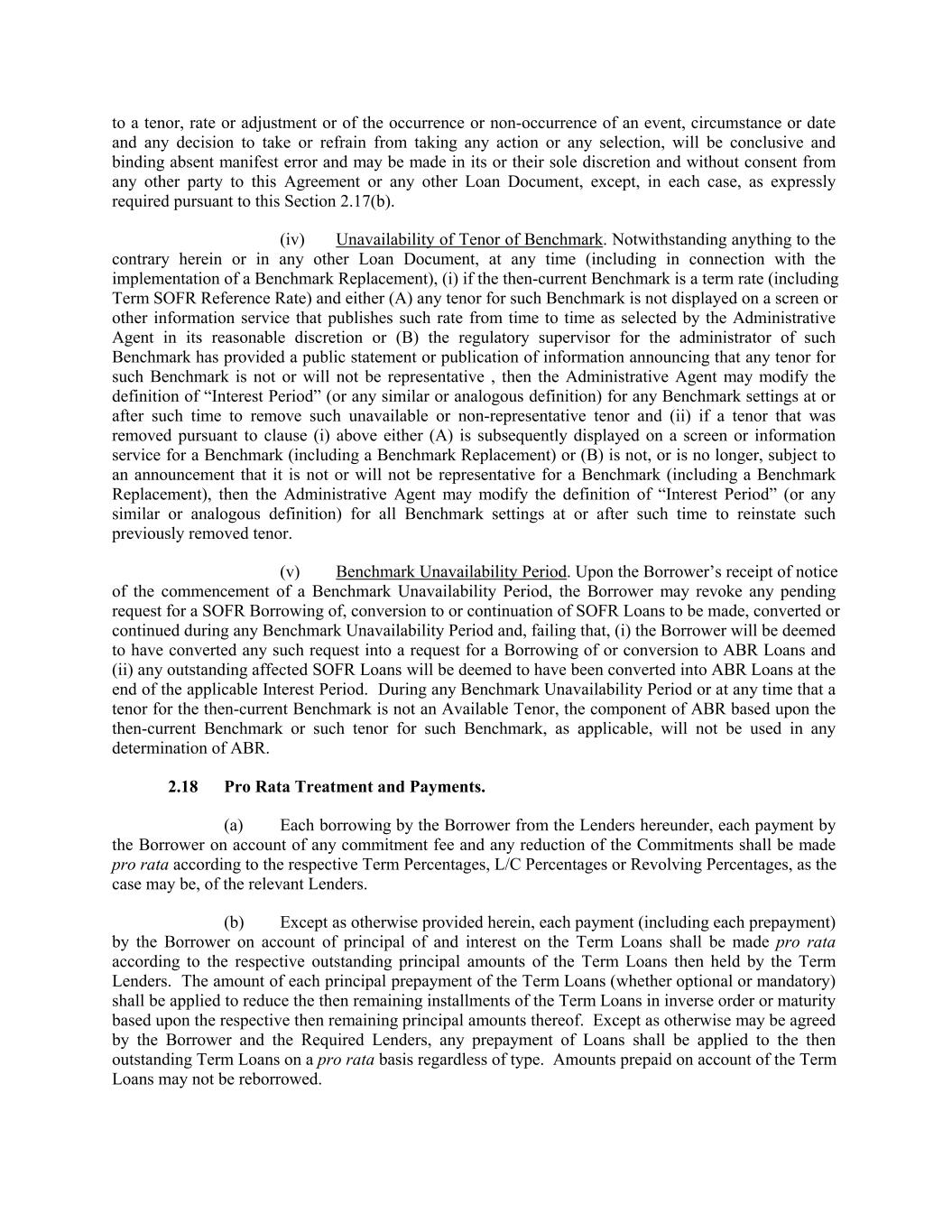 to a tenor, rate or adjustment or of the occurrence or non-occurrence of an event, circumstance or date and any decision to take or refrain from taking any action or any selection, will be conclusive and binding absent manifest error and may be made in its or their sole discretion and without consent from any other party to this Agreement or any other Loan Document, except, in each case, as expressly required pursuant to this Section 2.17(b). (iv) Unavailability of Tenor of Benchmark. Notwithstanding anything to the contrary herein or in any other Loan Document, at any time (including in connection with the implementation of a Benchmark Replacement), (i) if the then-current Benchmark is a term rate (including Term SOFR Reference Rate) and either (A) any tenor for such Benchmark is not displayed on a screen or other information service that publishes such rate from time to time as selected by the Administrative Agent in its reasonable discretion or (B) the regulatory supervisor for the administrator of such Benchmark has provided a public statement or publication of information announcing that any tenor for such Benchmark is not or will not be representative , then the Administrative Agent may modify the definition of “Interest Period” (or any similar or analogous definition) for any Benchmark settings at or after such time to remove such unavailable or non-representative tenor and (ii) if a tenor that was removed pursuant to clause (i) above either (A) is subsequently displayed on a screen or information service for a Benchmark (including a Benchmark Replacement) or (B) is not, or is no longer, subject to an announcement that it is not or will not be representative for a Benchmark (including a Benchmark Replacement), then the Administrative Agent may modify the definition of “Interest Period” (or any similar or analogous definition) for all Benchmark settings at or after such time to reinstate such previously removed tenor. (v) Benchmark Unavailability Period. Upon the Borrower’s receipt of notice of the commencement of a Benchmark Unavailability Period, the Borrower may revoke any pending request for a SOFR Borrowing of, conversion to or continuation of SOFR Loans to be made, converted or continued during any Benchmark Unavailability Period and, failing that, (i) the Borrower will be deemed to have converted any such request into a request for a Borrowing of or conversion to ABR Loans and (ii) any outstanding affected SOFR Loans will be deemed to have been converted into ABR Loans at the end of the applicable Interest Period. During any Benchmark Unavailability Period or at any time that a tenor for the then-current Benchmark is not an Available Tenor, the component of ABR based upon the then-current Benchmark or such tenor for such Benchmark, as applicable, will not be used in any determination of ABR. 2.18 Pro Rata Treatment and Payments. (a) Each borrowing by the Borrower from the Lenders hereunder, each payment by the Borrower on account of any commitment fee and any reduction of the Commitments shall be made pro rata according to the respective Term Percentages, L/C Percentages or Revolving Percentages, as the case may be, of the relevant Lenders. (b) Except as otherwise provided herein, each payment (including each prepayment) by the Borrower on account of principal of and interest on the Term Loans shall be made pro rata according to the respective outstanding principal amounts of the Term Loans then held by the Term Lenders. The amount of each principal prepayment of the Term Loans (whether optional or mandatory) shall be applied to reduce the then remaining installments of the Term Loans in inverse order or maturity based upon the respective then remaining principal amounts thereof. Except as otherwise may be agreed by the Borrower and the Required Lenders, any prepayment of Loans shall be applied to the then outstanding Term Loans on a pro rata basis regardless of type. Amounts prepaid on account of the Term Loans may not be reborrowed.