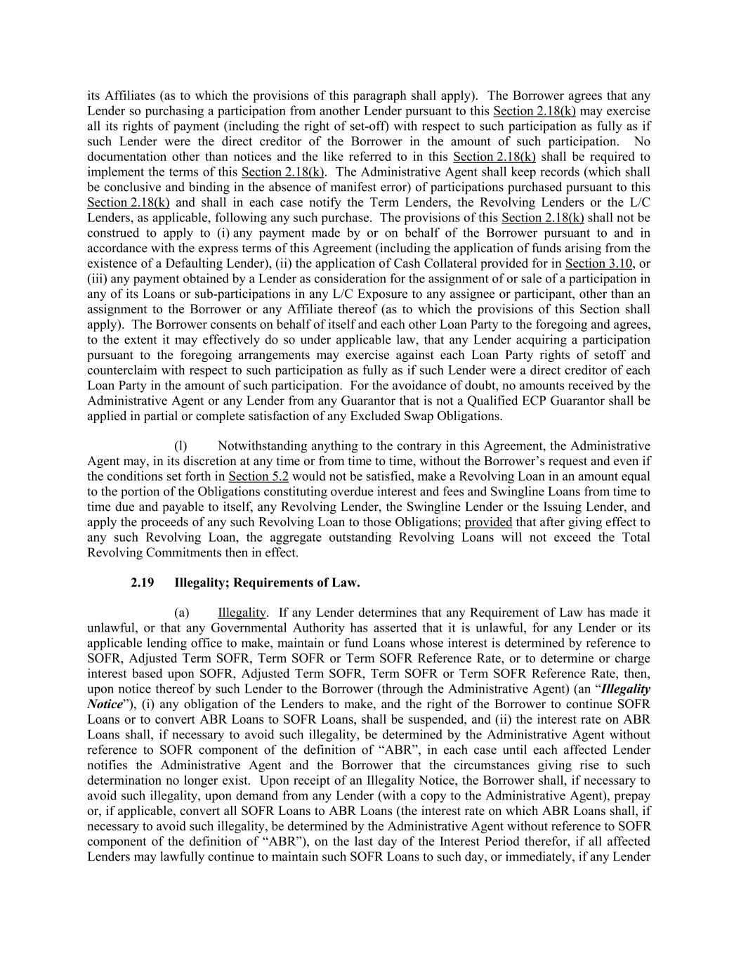 its Affiliates (as to which the provisions of this paragraph shall apply). The Borrower agrees that any Lender so purchasing a participation from another Lender pursuant to this Section 2.18(k) may exercise all its rights of payment (including the right of set-off) with respect to such participation as fully as if such Lender were the direct creditor of the Borrower in the amount of such participation. No documentation other than notices and the like referred to in this Section 2.18(k) shall be required to implement the terms of this Section 2.18(k). The Administrative Agent shall keep records (which shall be conclusive and binding in the absence of manifest error) of participations purchased pursuant to this Section 2.18(k) and shall in each case notify the Term Lenders, the Revolving Lenders or the L/C Lenders, as applicable, following any such purchase. The provisions of this Section 2.18(k) shall not be construed to apply to (i) any payment made by or on behalf of the Borrower pursuant to and in accordance with the express terms of this Agreement (including the application of funds arising from the existence of a Defaulting Lender), (ii) the application of Cash Collateral provided for in Section 3.10, or (iii) any payment obtained by a Lender as consideration for the assignment of or sale of a participation in any of its Loans or sub-participations in any L/C Exposure to any assignee or participant, other than an assignment to the Borrower or any Affiliate thereof (as to which the provisions of this Section shall apply). The Borrower consents on behalf of itself and each other Loan Party to the foregoing and agrees, to the extent it may effectively do so under applicable law, that any Lender acquiring a participation pursuant to the foregoing arrangements may exercise against each Loan Party rights of setoff and counterclaim with respect to such participation as fully as if such Lender were a direct creditor of each Loan Party in the amount of such participation. For the avoidance of doubt, no amounts received by the Administrative Agent or any Lender from any Guarantor that is not a Qualified ECP Guarantor shall be applied in partial or complete satisfaction of any Excluded Swap Obligations. (l) Notwithstanding anything to the contrary in this Agreement, the Administrative Agent may, in its discretion at any time or from time to time, without the Borrower’s request and even if the conditions set forth in Section 5.2 would not be satisfied, make a Revolving Loan in an amount equal to the portion of the Obligations constituting overdue interest and fees and Swingline Loans from time to time due and payable to itself, any Revolving Lender, the Swingline Lender or the Issuing Lender, and apply the proceeds of any such Revolving Loan to those Obligations; provided that after giving effect to any such Revolving Loan, the aggregate outstanding Revolving Loans will not exceed the Total Revolving Commitments then in effect. 2.19 Illegality; Requirements of Law. (a) Illegality. If any Lender determines that any Requirement of Law has made it unlawful, or that any Governmental Authority has asserted that it is unlawful, for any Lender or its applicable lending office to make, maintain or fund Loans whose interest is determined by reference to SOFR, Adjusted Term SOFR, Term SOFR or Term SOFR Reference Rate, or to determine or charge interest based upon SOFR, Adjusted Term SOFR, Term SOFR or Term SOFR Reference Rate, then, upon notice thereof by such Lender to the Borrower (through the Administrative Agent) (an “Illegality Notice”), (i) any obligation of the Lenders to make, and the right of the Borrower to continue SOFR Loans or to convert ABR Loans to SOFR Loans, shall be suspended, and (ii) the interest rate on ABR Loans shall, if necessary to avoid such illegality, be determined by the Administrative Agent without reference to SOFR component of the definition of “ABR”, in each case until each affected Lender notifies the Administrative Agent and the Borrower that the circumstances giving rise to such determination no longer exist. Upon receipt of an Illegality Notice, the Borrower shall, if necessary to avoid such illegality, upon demand from any Lender (with a copy to the Administrative Agent), prepay or, if applicable, convert all SOFR Loans to ABR Loans (the interest rate on which ABR Loans shall, if necessary to avoid such illegality, be determined by the Administrative Agent without reference to SOFR component of the definition of “ABR”), on the last day of the Interest Period therefor, if all affected Lenders may lawfully continue to maintain such SOFR Loans to such day, or immediately, if any Lender