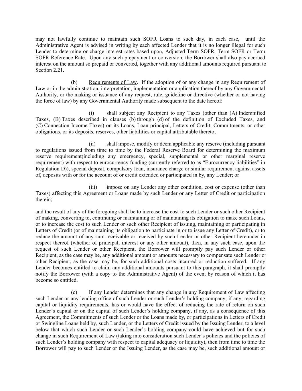 may not lawfully continue to maintain such SOFR Loans to such day, in each case, until the Administrative Agent is advised in writing by each affected Lender that it is no longer illegal for such Lender to determine or charge interest rates based upon, Adjusted Term SOFR, Term SOFR or Term SOFR Reference Rate. Upon any such prepayment or conversion, the Borrower shall also pay accrued interest on the amount so prepaid or converted, together with any additional amounts required pursuant to Section 2.21. (b) Requirements of Law. If the adoption of or any change in any Requirement of Law or in the administration, interpretation, implementation or application thereof by any Governmental Authority, or the making or issuance of any request, rule, guideline or directive (whether or not having the force of law) by any Governmental Authority made subsequent to the date hereof: (i) shall subject any Recipient to any Taxes (other than (A) Indemnified Taxes, (B) Taxes described in clauses (b) through (d) of the definition of Excluded Taxes, and (C) Connection Income Taxes) on its Loans, Loan principal, Letters of Credit, Commitments, or other obligations, or its deposits, reserves, other liabilities or capital attributable thereto; (ii) shall impose, modify or deem applicable any reserve (including pursuant to regulations issued from time to time by the Federal Reserve Board for determining the maximum reserve requirement(including any emergency, special, supplemental or other marginal reserve requirement) with respect to eurocurrency funding (currently referred to as “Eurocurrency liabilities” in Regulation D)), special deposit, compulsory loan, insurance charge or similar requirement against assets of, deposits with or for the account of or credit extended or participated in by, any Lender; or (iii) impose on any Lender any other condition, cost or expense (other than Taxes) affecting this Agreement or Loans made by such Lender or any Letter of Credit or participation therein; and the result of any of the foregoing shall be to increase the cost to such Lender or such other Recipient of making, converting to, continuing or maintaining or of maintaining its obligation to make such Loans, or to increase the cost to such Lender or such other Recipient of issuing, maintaining or participating in Letters of Credit (or of maintaining its obligation to participate in or to issue any Letter of Credit), or to reduce the amount of any sum receivable or received by such Lender or other Recipient hereunder in respect thereof (whether of principal, interest or any other amount), then, in any such case, upon the request of such Lender or other Recipient, the Borrower will promptly pay such Lender or other Recipient, as the case may be, any additional amount or amounts necessary to compensate such Lender or other Recipient, as the case may be, for such additional costs incurred or reduction suffered. If any Lender becomes entitled to claim any additional amounts pursuant to this paragraph, it shall promptly notify the Borrower (with a copy to the Administrative Agent) of the event by reason of which it has become so entitled. (c) If any Lender determines that any change in any Requirement of Law affecting such Lender or any lending office of such Lender or such Lender’s holding company, if any, regarding capital or liquidity requirements, has or would have the effect of reducing the rate of return on such Lender’s capital or on the capital of such Lender’s holding company, if any, as a consequence of this Agreement, the Commitments of such Lender or the Loans made by, or participations in Letters of Credit or Swingline Loans held by, such Lender, or the Letters of Credit issued by the Issuing Lender, to a level below that which such Lender or such Lender’s holding company could have achieved but for such change in such Requirement of Law (taking into consideration such Lender’s policies and the policies of such Lender’s holding company with respect to capital adequacy or liquidity), then from time to time the Borrower will pay to such Lender or the Issuing Lender, as the case may be, such additional amount or