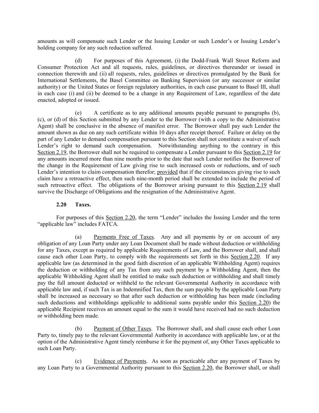 amounts as will compensate such Lender or the Issuing Lender or such Lender’s or Issuing Lender’s holding company for any such reduction suffered. (d) For purposes of this Agreement, (i) the Dodd-Frank Wall Street Reform and Consumer Protection Act and all requests, rules, guidelines, or directives thereunder or issued in connection therewith and (ii) all requests, rules, guidelines or directives promulgated by the Bank for International Settlements, the Basel Committee on Banking Supervision (or any successor or similar authority) or the United States or foreign regulatory authorities, in each case pursuant to Basel III, shall in each case (i) and (ii) be deemed to be a change in any Requirement of Law, regardless of the date enacted, adopted or issued. (e) A certificate as to any additional amounts payable pursuant to paragraphs (b), (c), or (d) of this Section submitted by any Lender to the Borrower (with a copy to the Administrative Agent) shall be conclusive in the absence of manifest error. The Borrower shall pay such Lender the amount shown as due on any such certificate within 10 days after receipt thereof. Failure or delay on the part of any Lender to demand compensation pursuant to this Section shall not constitute a waiver of such Lender’s right to demand such compensation. Notwithstanding anything to the contrary in this Section 2.19, the Borrower shall not be required to compensate a Lender pursuant to this Section 2.19 for any amounts incurred more than nine months prior to the date that such Lender notifies the Borrower of the change in the Requirement of Law giving rise to such increased costs or reductions, and of such Lender’s intention to claim compensation therefor; provided that if the circumstances giving rise to such claim have a retroactive effect, then such nine-month period shall be extended to include the period of such retroactive effect. The obligations of the Borrower arising pursuant to this Section 2.19 shall survive the Discharge of Obligations and the resignation of the Administrative Agent. 2.20 Taxes. For purposes of this Section 2.20, the term “Lender” includes the Issuing Lender and the term “applicable law” includes FATCA. (a) Payments Free of Taxes. Any and all payments by or on account of any obligation of any Loan Party under any Loan Document shall be made without deduction or withholding for any Taxes, except as required by applicable Requirements of Law, and the Borrower shall, and shall cause each other Loan Party, to comply with the requirements set forth in this Section 2.20. If any applicable law (as determined in the good faith discretion of an applicable Withholding Agent) requires the deduction or withholding of any Tax from any such payment by a Withholding Agent, then the applicable Withholding Agent shall be entitled to make such deduction or withholding and shall timely pay the full amount deducted or withheld to the relevant Governmental Authority in accordance with applicable law and, if such Tax is an Indemnified Tax, then the sum payable by the applicable Loan Party shall be increased as necessary so that after such deduction or withholding has been made (including such deductions and withholdings applicable to additional sums payable under this Section 2.20) the applicable Recipient receives an amount equal to the sum it would have received had no such deduction or withholding been made. (b) Payment of Other Taxes. The Borrower shall, and shall cause each other Loan Party to, timely pay to the relevant Governmental Authority in accordance with applicable law, or at the option of the Administrative Agent timely reimburse it for the payment of, any Other Taxes applicable to such Loan Party. (c) Evidence of Payments. As soon as practicable after any payment of Taxes by any Loan Party to a Governmental Authority pursuant to this Section 2.20, the Borrower shall, or shall