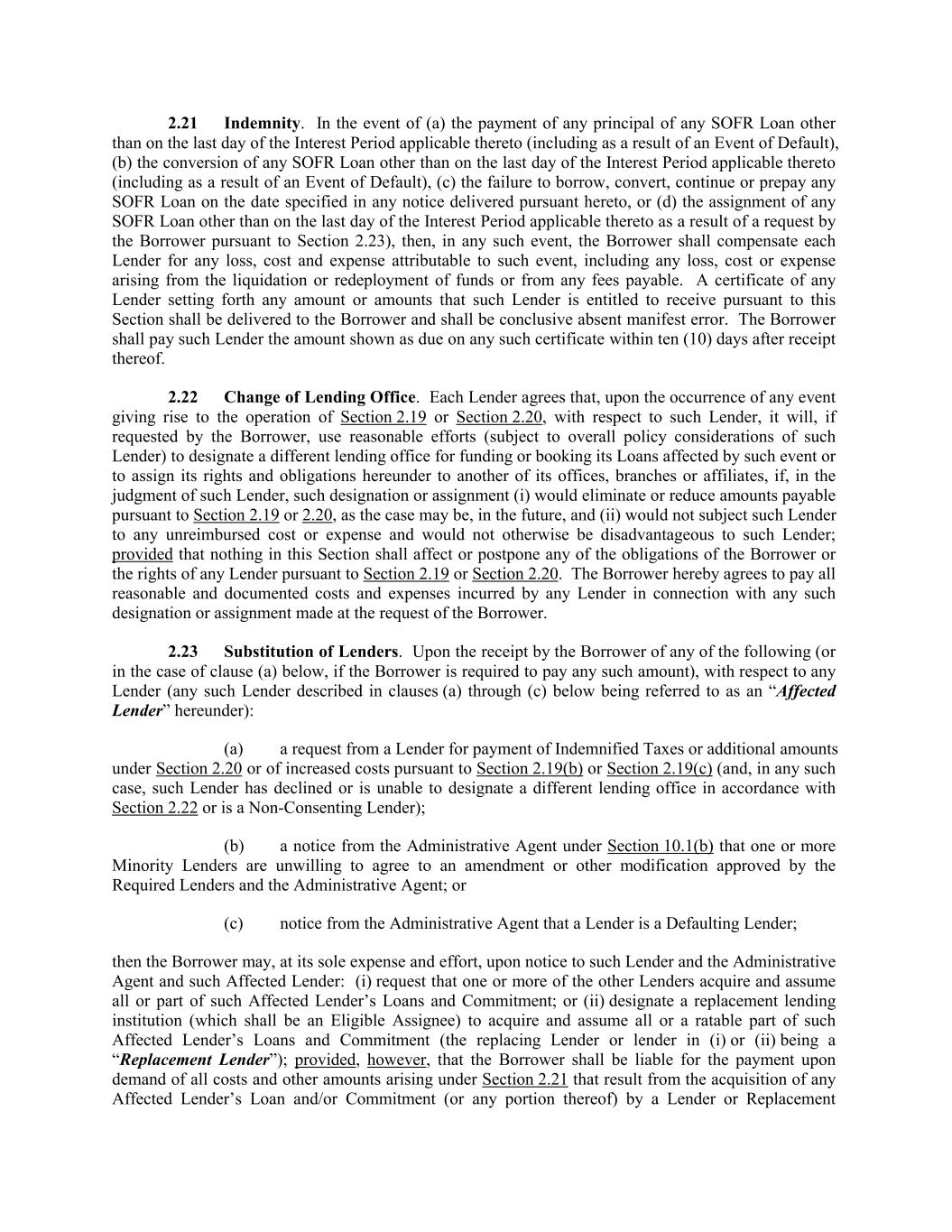 2.21 Indemnity. In the event of (a) the payment of any principal of any SOFR Loan other than on the last day of the Interest Period applicable thereto (including as a result of an Event of Default), (b) the conversion of any SOFR Loan other than on the last day of the Interest Period applicable thereto (including as a result of an Event of Default), (c) the failure to borrow, convert, continue or prepay any SOFR Loan on the date specified in any notice delivered pursuant hereto, or (d) the assignment of any SOFR Loan other than on the last day of the Interest Period applicable thereto as a result of a request by the Borrower pursuant to Section 2.23), then, in any such event, the Borrower shall compensate each Lender for any loss, cost and expense attributable to such event, including any loss, cost or expense arising from the liquidation or redeployment of funds or from any fees payable. A certificate of any Lender setting forth any amount or amounts that such Lender is entitled to receive pursuant to this Section shall be delivered to the Borrower and shall be conclusive absent manifest error. The Borrower shall pay such Lender the amount shown as due on any such certificate within ten (10) days after receipt thereof. 2.22 Change of Lending Office. Each Lender agrees that, upon the occurrence of any event giving rise to the operation of Section 2.19 or Section 2.20, with respect to such Lender, it will, if requested by the Borrower, use reasonable efforts (subject to overall policy considerations of such Lender) to designate a different lending office for funding or booking its Loans affected by such event or to assign its rights and obligations hereunder to another of its offices, branches or affiliates, if, in the judgment of such Lender, such designation or assignment (i) would eliminate or reduce amounts payable pursuant to Section 2.19 or 2.20, as the case may be, in the future, and (ii) would not subject such Lender to any unreimbursed cost or expense and would not otherwise be disadvantageous to such Lender; provided that nothing in this Section shall affect or postpone any of the obligations of the Borrower or the rights of any Lender pursuant to Section 2.19 or Section 2.20. The Borrower hereby agrees to pay all reasonable and documented costs and expenses incurred by any Lender in connection with any such designation or assignment made at the request of the Borrower. 2.23 Substitution of Lenders. Upon the receipt by the Borrower of any of the following (or in the case of clause (a) below, if the Borrower is required to pay any such amount), with respect to any Lender (any such Lender described in clauses (a) through (c) below being referred to as an “Affected Lender” hereunder): (a) a request from a Lender for payment of Indemnified Taxes or additional amounts under Section 2.20 or of increased costs pursuant to Section 2.19(b) or Section 2.19(c) (and, in any such case, such Lender has declined or is unable to designate a different lending office in accordance with Section 2.22 or is a Non-Consenting Lender); (b) a notice from the Administrative Agent under Section 10.1(b) that one or more Minority Lenders are unwilling to agree to an amendment or other modification approved by the Required Lenders and the Administrative Agent; or (c) notice from the Administrative Agent that a Lender is a Defaulting Lender; then the Borrower may, at its sole expense and effort, upon notice to such Lender and the Administrative Agent and such Affected Lender: (i) request that one or more of the other Lenders acquire and assume all or part of such Affected Lender’s Loans and Commitment; or (ii) designate a replacement lending institution (which shall be an Eligible Assignee) to acquire and assume all or a ratable part of such Affected Lender’s Loans and Commitment (the replacing Lender or lender in (i) or (ii) being a “Replacement Lender”); provided, however, that the Borrower shall be liable for the payment upon demand of all costs and other amounts arising under Section 2.21 that result from the acquisition of any Affected Lender’s Loan and/or Commitment (or any portion thereof) by a Lender or Replacement
